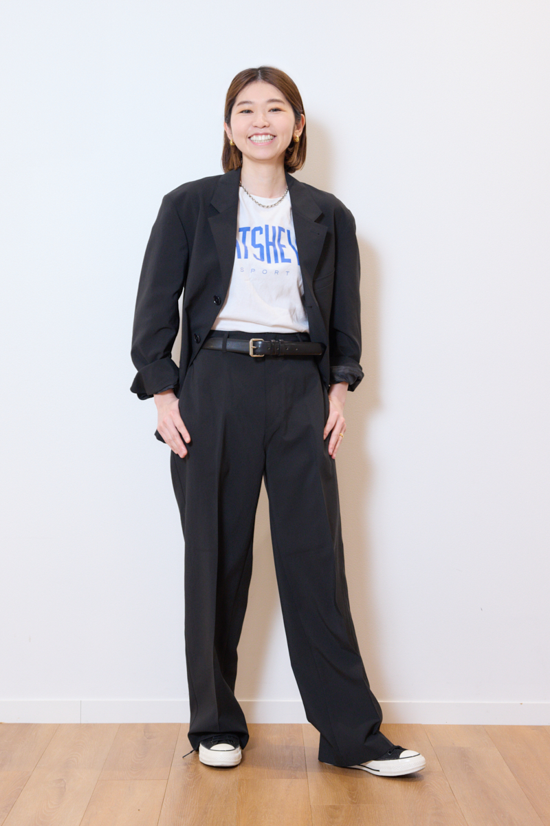 シンプルな無地のTシャツを合わせて通勤服や参観日服としてシックに着るのはもちろん、ロゴTをインしてほどよく力を抜いたスタイルもおすすめ! ロゴT単体だとカジュアルになりすぎてしまう…という悩みもジャケットのきちんと感で解決してくれます。