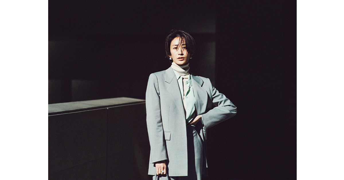 タートルニット¥53,900(ドゥロワー/ドゥロワー 青山店)ジャケット¥68,200シャツ¥31,900パンツ¥41,800(すべてセオリー/リンク・セオリー・ジャパン)バッグ¥462,000(予定価格)(バレンシアガ/バレンシアガ クライアントサービス)イヤリング¥1,276,000リング¥1,062,600(ともにTASAKI)