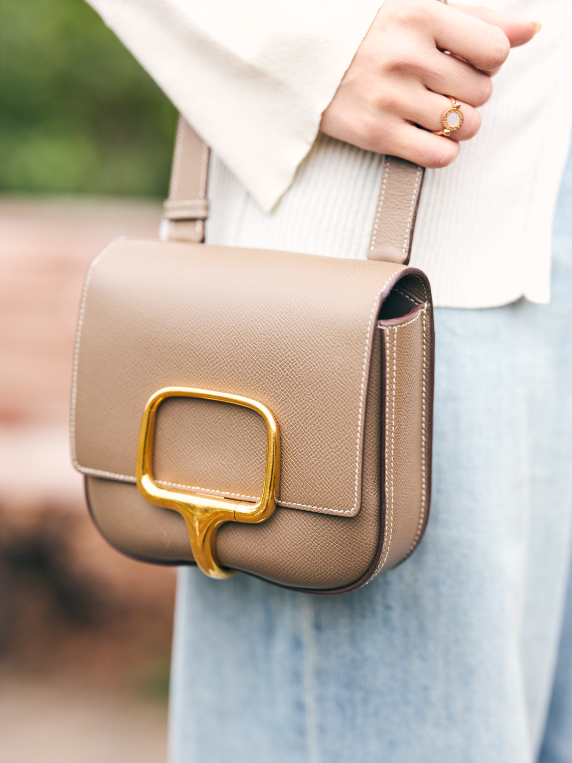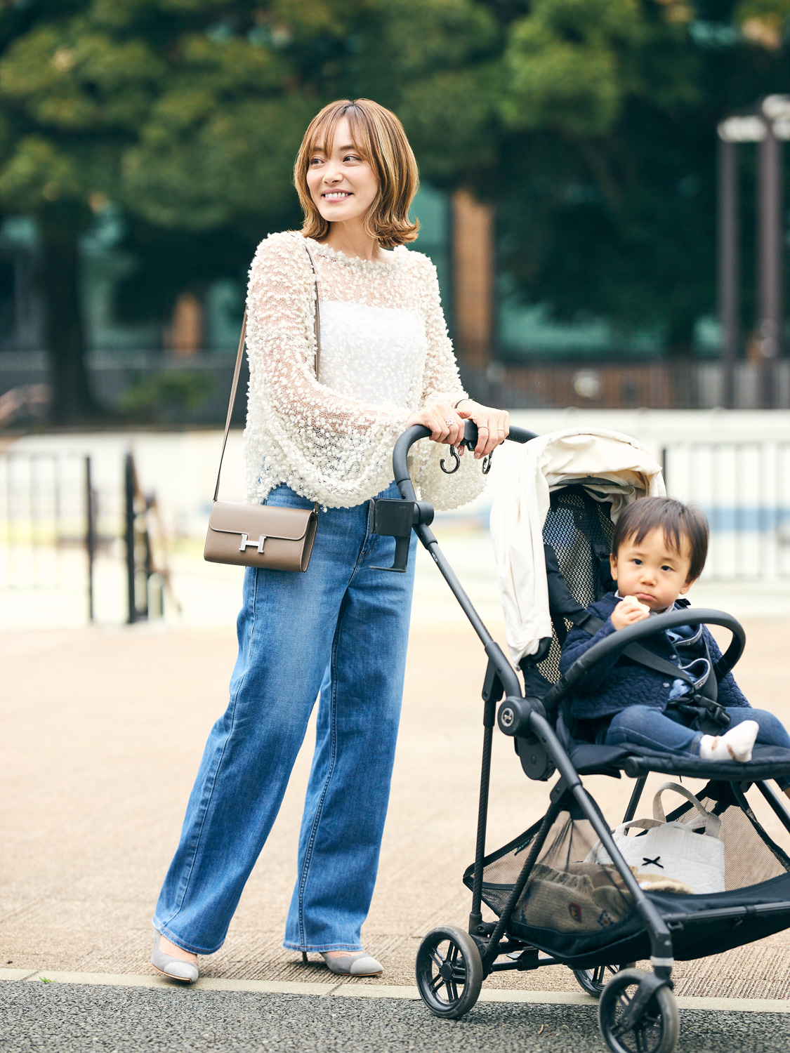 「コンスタンスのトゥー・ゴーはお財布機能付きのショルダーで、身軽に出かけられるコンパクトさと、子どもと一緒でも両手が空くのが魅力。クラッチとして和装に合わせることも。デニムのブルーとトップスのホワイトにエトゥープを合わせ、全体を柔らかいイメージでまとめました。カジュアルな日にカチッとしたバッグを合わせると、ラフに見えず上品にまとまります」小野星奈さん/会社員(育休中)・167㎝(2歳と1歳の男の子ママ)
