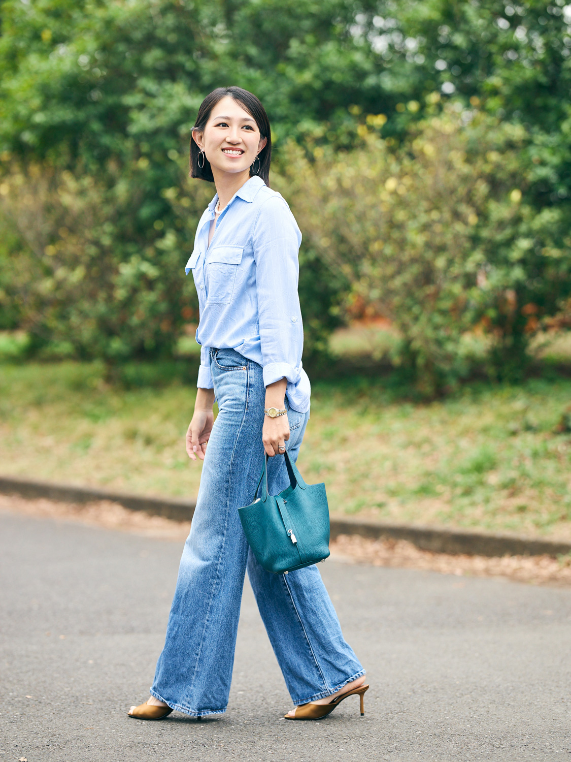 「義理の姉から譲ってもらったピコタンのニューブルージーンは、特別な宝物。型崩れしないよう専用のクッションを入れたりと、収納の仕方にも気を配っています。コーデはブルー系でまとめて、バッグの金具とアクセサリーをシルバーにして統一感を出しました。デニムと相性がいいので、ついつい手に取ってしまうアイテムです」濱野かやさん/主婦・164㎝(6歳と3歳の男の子ママ)