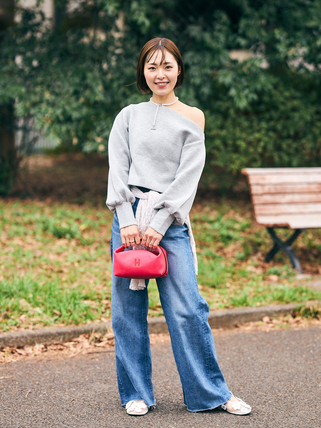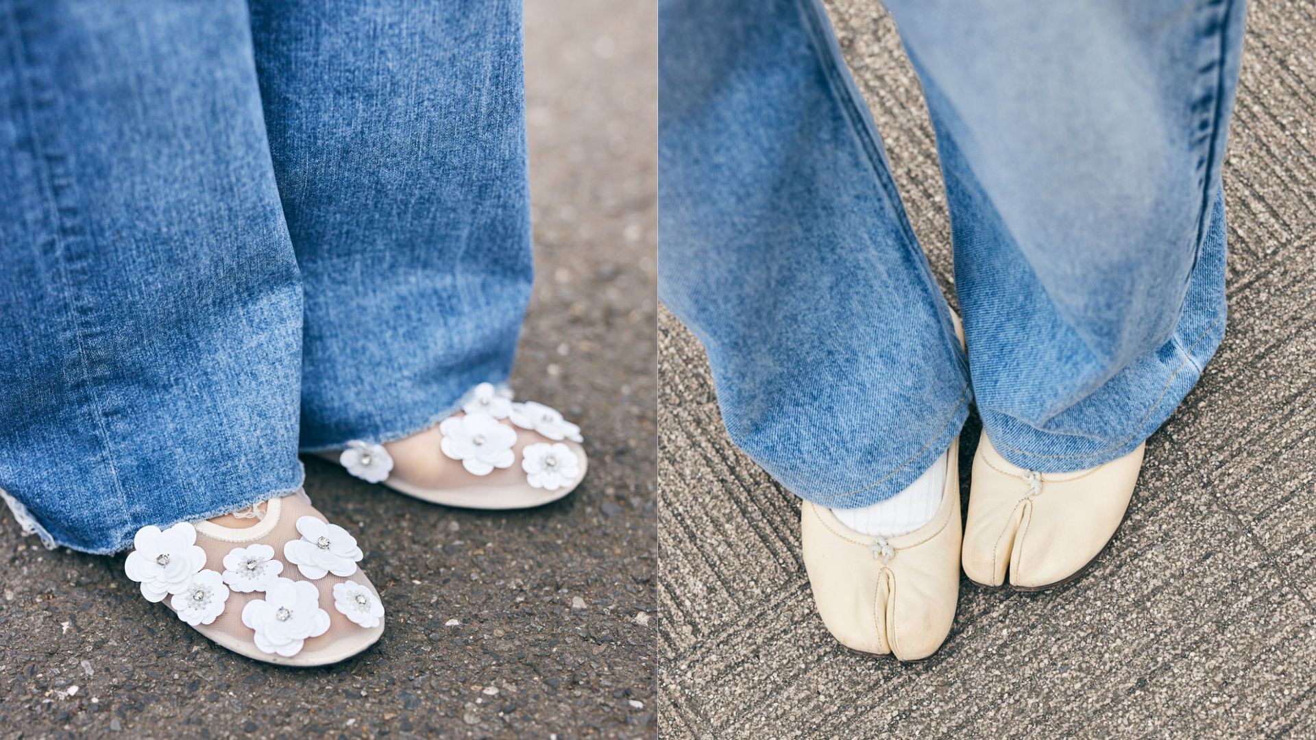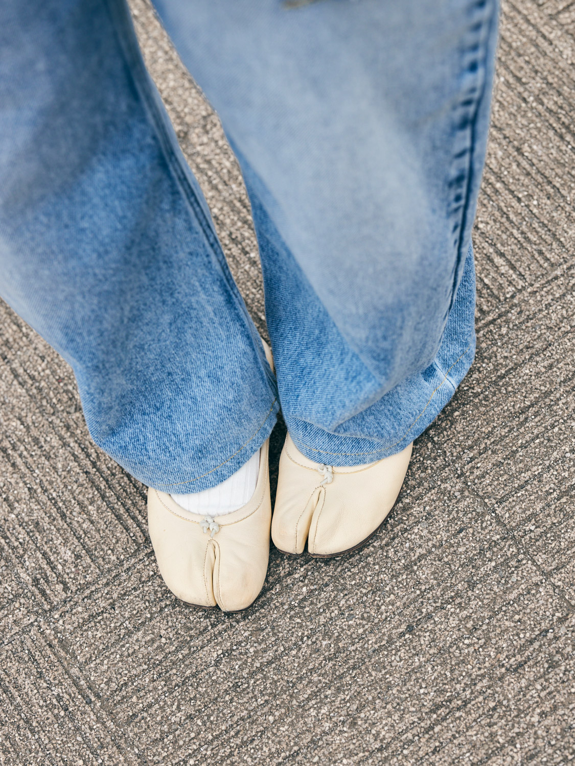 「足のサイズが21.0㎝と小さく、なかなか自分に合う一足に出会えないなかで選んだのがマルジェラの足袋シューズ。足の指が安定するので1サイズ上でも靴擦れせず、つま先の特徴的なデザインはこなれ感も出るので、つい頼りにしちゃいます。ベビーカーのブレーキでつま先が汚れやすいので、小まめにクリームでお手入れをしたり、シーズンごとにソールを確認してリペアに出しています。デニムと靴のブランドを揃えると、より世界観や雰囲気がマッチすると思っています」山本瞳美さん/化粧品会社勤務・152㎝(2歳の男の子ママ)