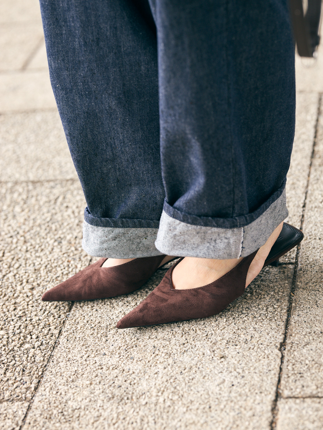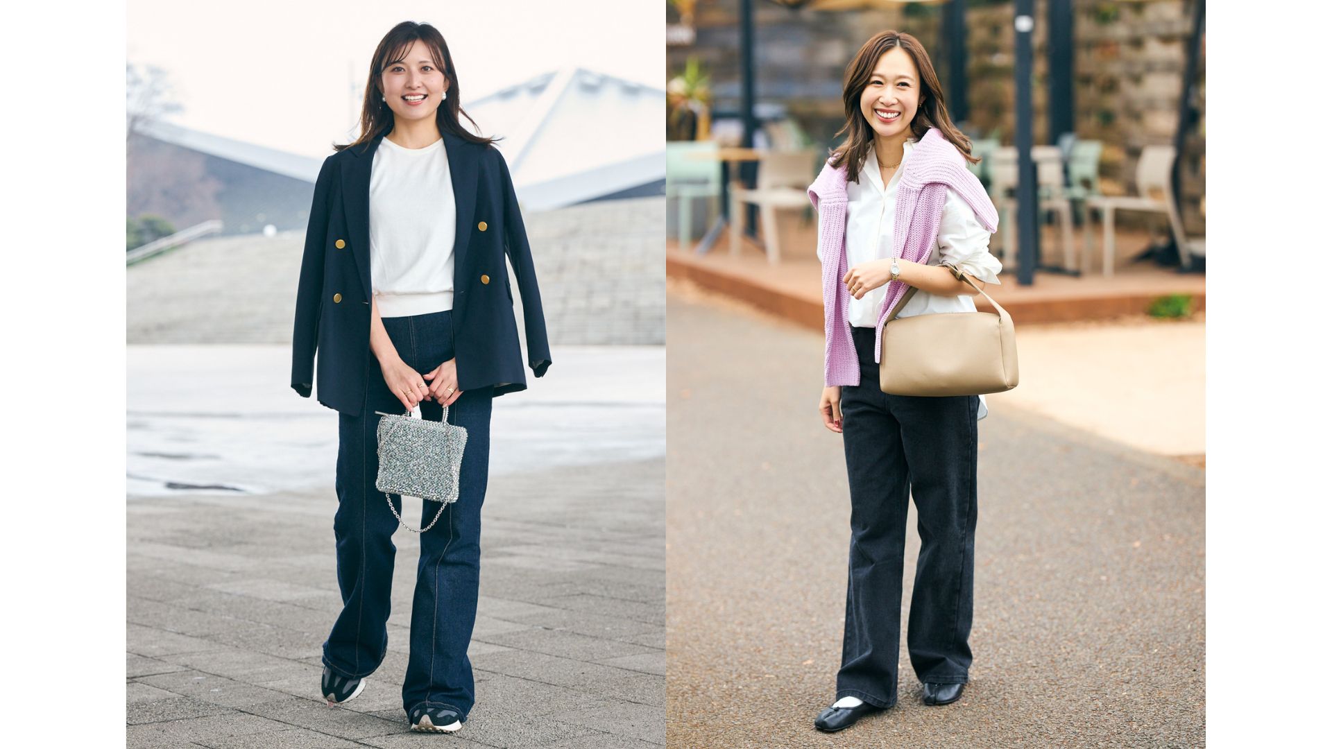 「濃いめのデニムはカジュアルになりすぎず、コーデ全体が引き締まってきちんと感が出せます。手持ちも自然とブラックや濃紺が多くなり、シーンを問わず頼れる存在に。今日はデニムとシャツのベーシックな組み合わせに、ピンクニットを肩掛けして春らしさをプラスしました。シンプルでも大人っぽくまとまるバランスを意識しています」喜多見香穂里さん/自営業・163cm(1歳の男の子ママ)