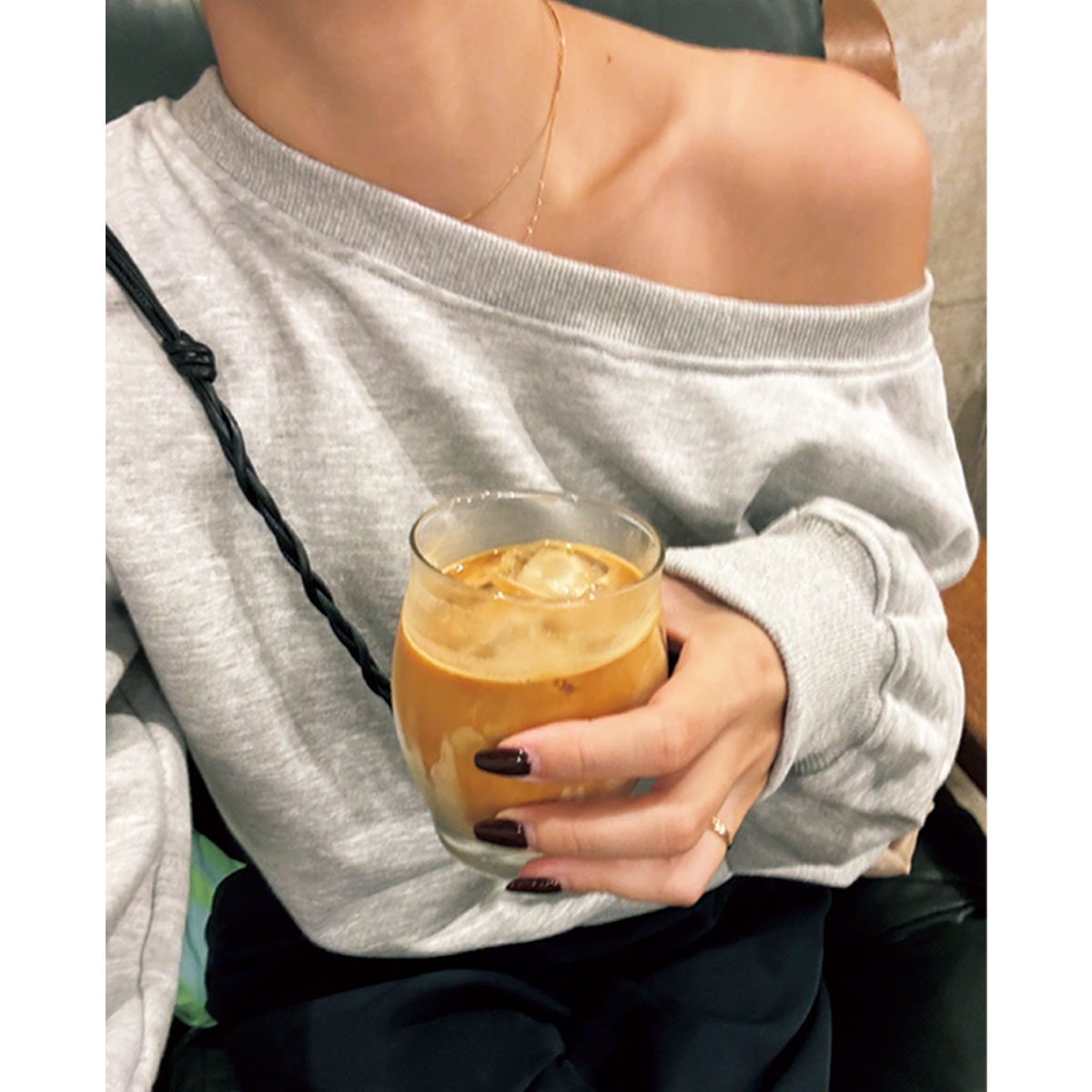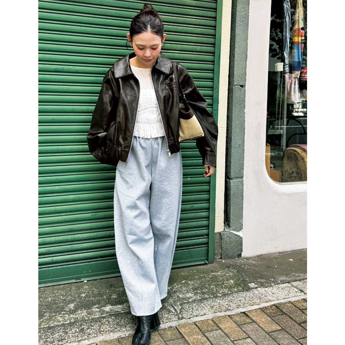 お散歩途中にお気に入りのカフェでラテをテイクアウトすることも。普段からカジュアル服が定番なので、オーバーサイズJKやレザー小物できちんと感をプラスします。JKはBLOSSOM HCOMPANY、ブーツはローソウル。