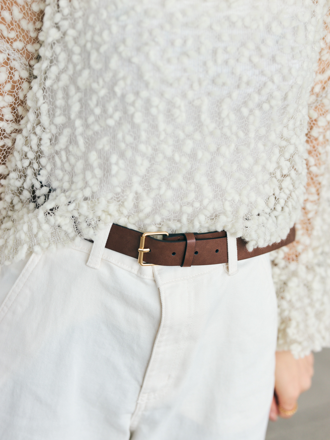 「肌見せトップスは、素材やデザインを変えて1年中着ています。トップスはシーニュのポップアップで購入。シアーな素材はコーデに抜け感が出て、全体のバランスがよくなる気がして好きなんです。甘くなりすぎないようボトムスとのバランスを意識してコーディネートしたり、着用シーンは選ぶようにしています」天野結香さん/主婦・160cm(8歳の女の子と5歳の男の子ママ)