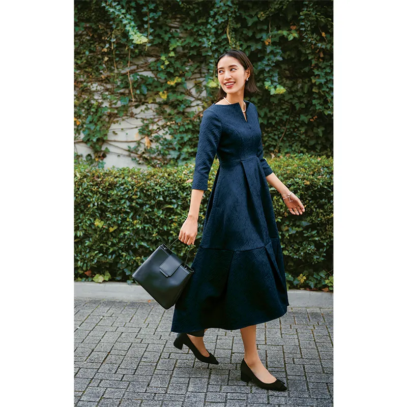ワンピース¥25,300(ローブブラン)バッグ¥8,800(VS セレクション)ピアス¥19,800バングル¥27,500(ともにウノアエレシルバーコレクション/ウノアエレ ジャパン)ネックレス¥22,000(ジゼルバー/ズットホリック)パンプス¥28,600(ツル バイ マリコ オイカワ)