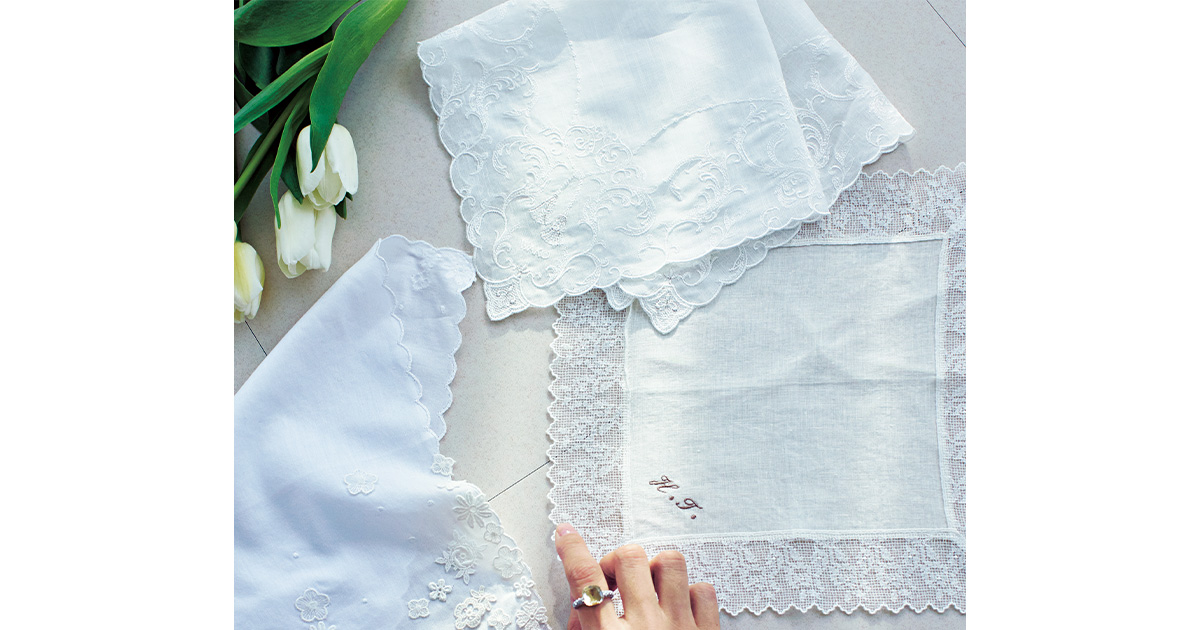 刺繡によるイニシャルの名入れも可能なハンカチ専門店。フォーマルな場でも自分らしさを残せる、今の気分に寄り添った抜け感が心地よいレースハンカチが見つかります。