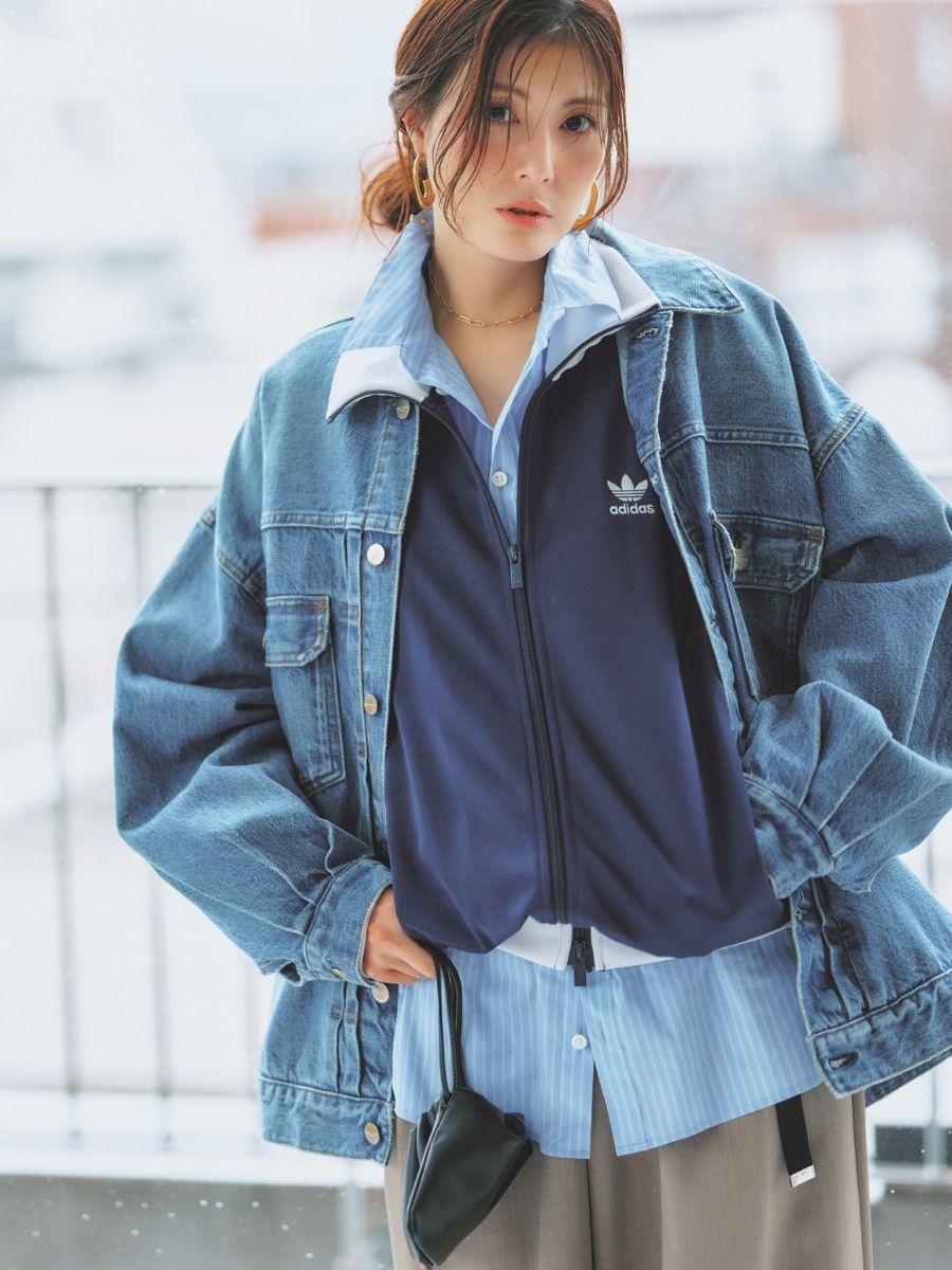 レイヤードが得意なオーバーサイズのデニムジャケットは、朝晩と日中の気温差が激しい春にうってつけ。冷え込みそうな日には流行りのトラックジャケットを重ねておけば、体もオシャレ心も温かく♡ 色をブルー系で統一するとスポーティ度合いが軽減されます。デニムジャケットはレッドカード トーキョー、ジャケットはアディダス オリジナルス、シャツはハウント、パンツはアダム エ ロペのもの。