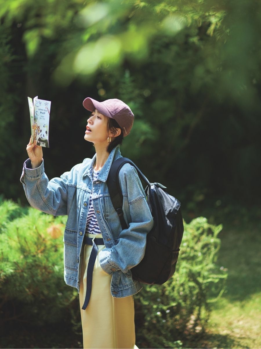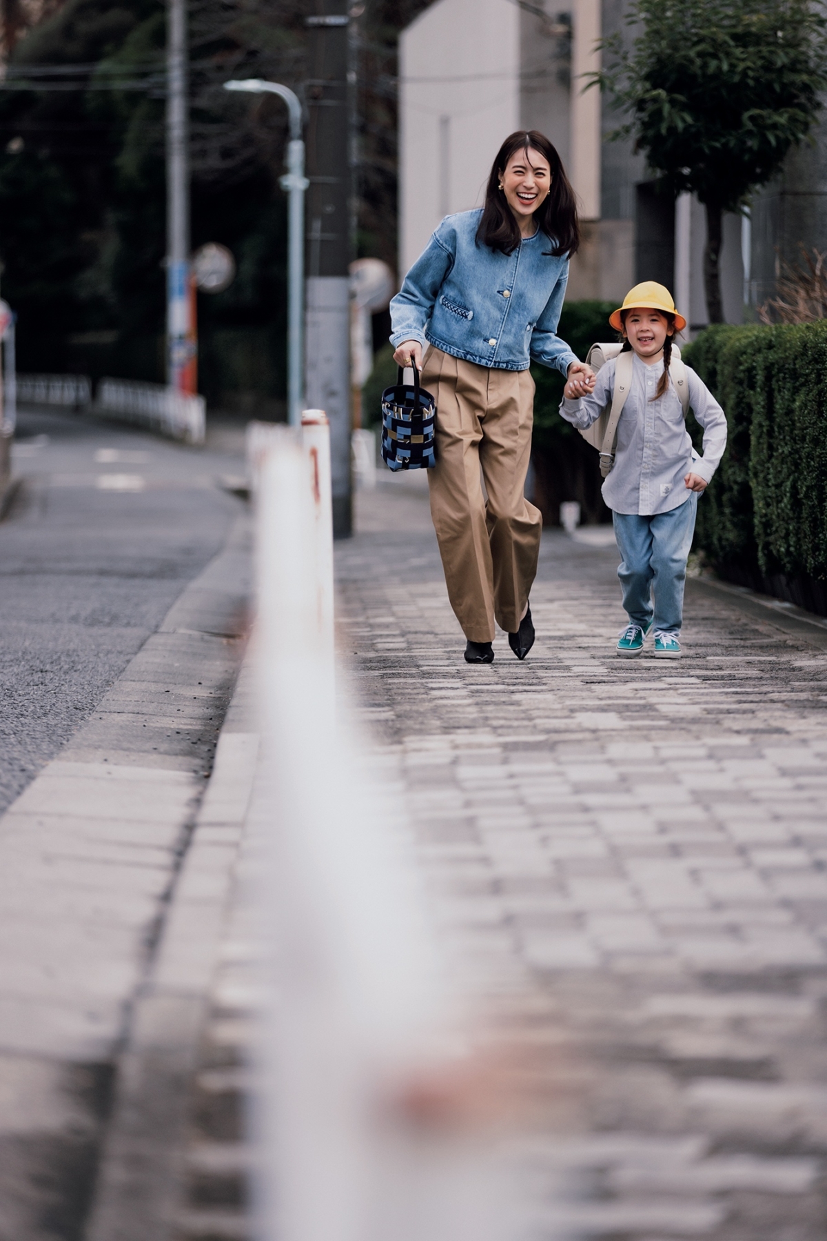 黒リュックと好相性なデニムジャケットは、親子遠足など荷物の増えるイベントにも活躍。タックパンツやほんのり光沢のあるキレイめパンツを合わせれば、ほっこり感もなくなります。デニムジャケットはミースロエ、カットソーはルミノア、パンツはボールジィ、キャップはプロタゴニスタ、リュックはモノリスのもの。
