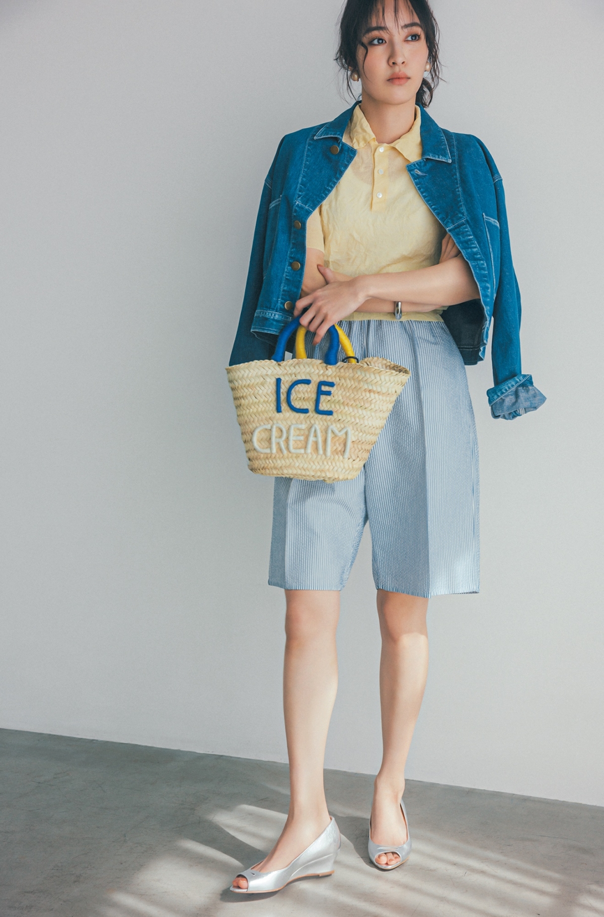 デニムパンツがどんなトップスとも似合うように、デニムジャケットも包容力の高さに定評あり。春らしいピンクやレモンイエローといった淡いカラーも、デニムジャケットを羽織ることでエッジが効き、大人っぽくコーディネートできそう。デニムジャケットはRHC、ニットポロはオーラリー、ハーフパンツはポステレガント、バッグはキロメートル パリ、靴はペリーコのもの。