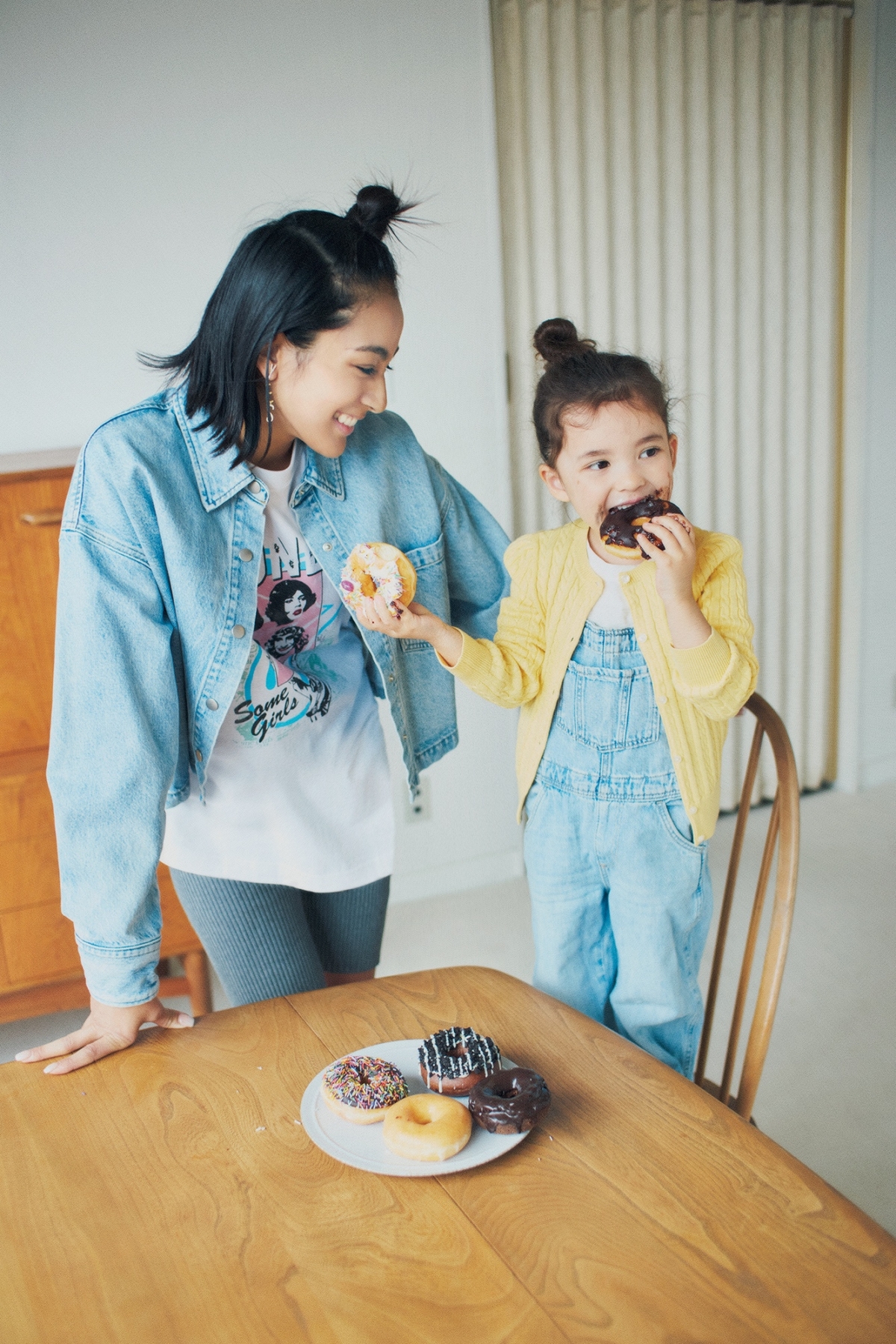 とにかく楽ちんで、家の中で頼りきりになるロックTとレギンスというラフなコーデも、デニムジャケットを羽織れば街に出られるオシャレ着に。動きやすさはそのままだから、自転車に乗ったり公園に行ったりとアクティブなシーンにもおすすめ。デニムジャケットはサードマガジン、TシャツはGOOD ROCK SPEED、レギンスはミラ オーウェンのもの。