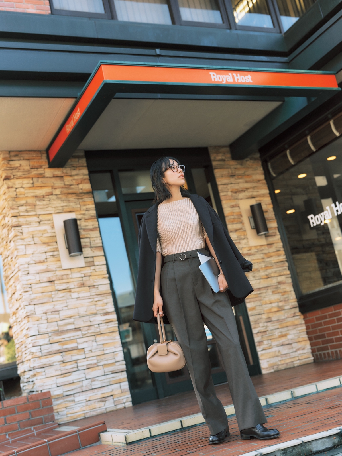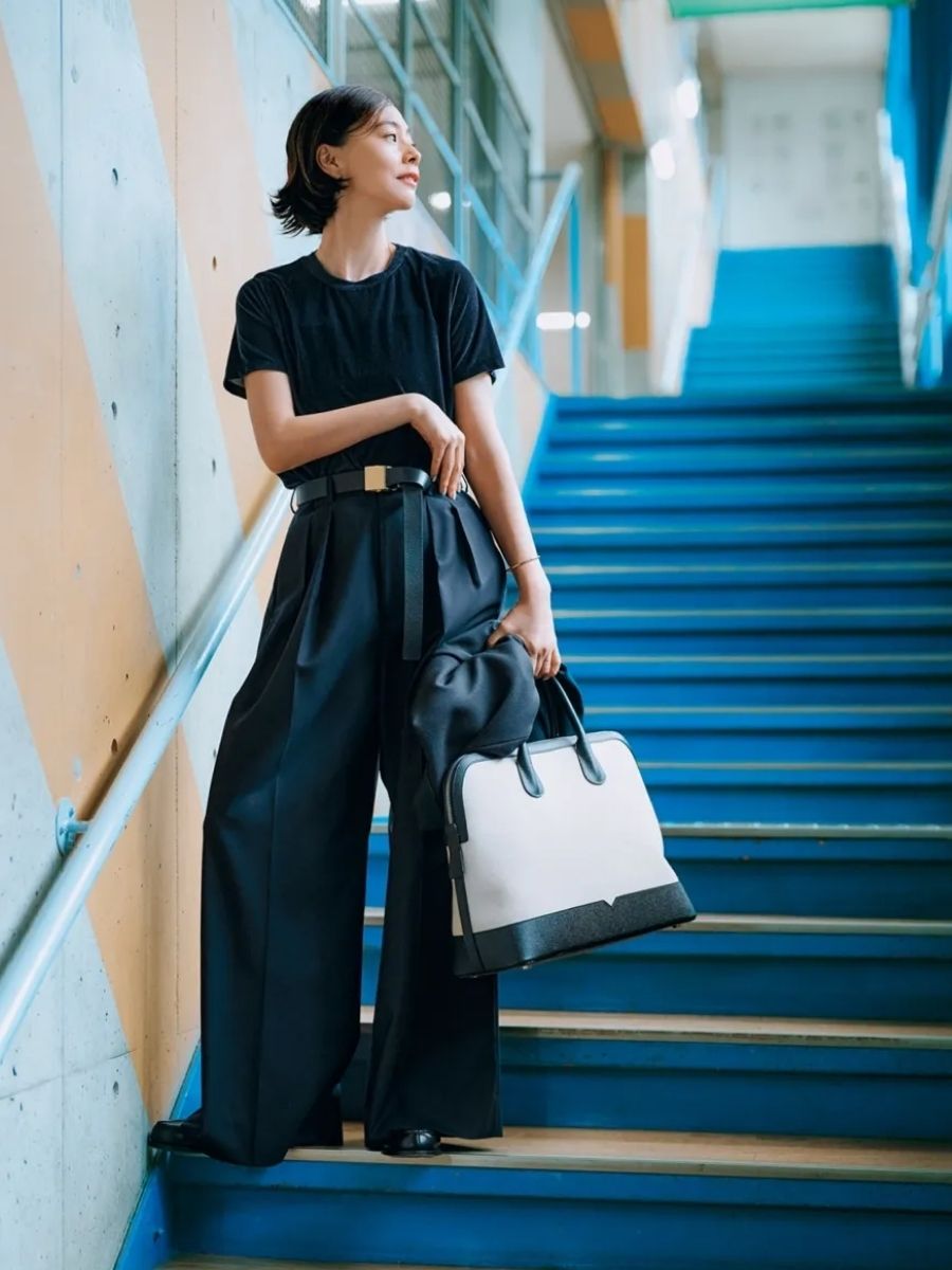ワイドパンツの足元をローファーにすると、落ち着きが増して余裕が感じられそう。シンプルなコーデもエッジィに仕上げてくれるから、毎日の通勤コーデにもおすすめです。ローファーはジェイエムウエストン、ジャケットはザハイライツ、トップスはマ ミュリエー、パンツはエモエレ、バッグはガブリエラ ハーストのもの。
