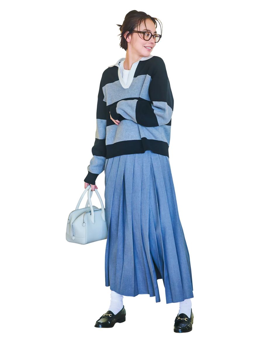 素足には若干早い時期の、スカートの足元問題。ローファーならソックスも似合いつつ、キレイさもキープ。靴を脱ぐ習い事や園行事に対応できるのも高ポイント。ラガーシャツ風のトップスにプリーツスカートのトラッド要素の詰まったスタイルは、グレートーンの配色で大人な雰囲気に。ローファーはダイアナ、ニットはユニクロ、スカートはイレーヴ、ソックスは靴下屋、バッグはヴァジックのもの。