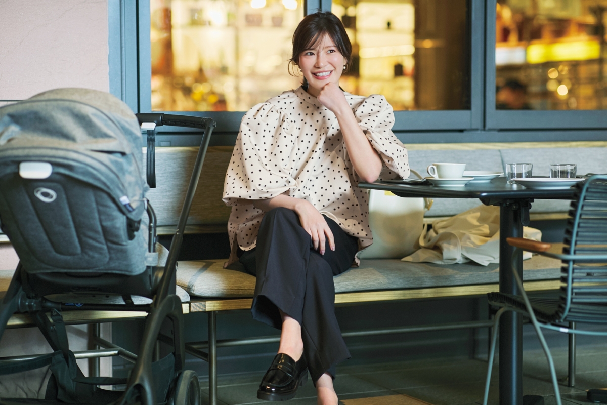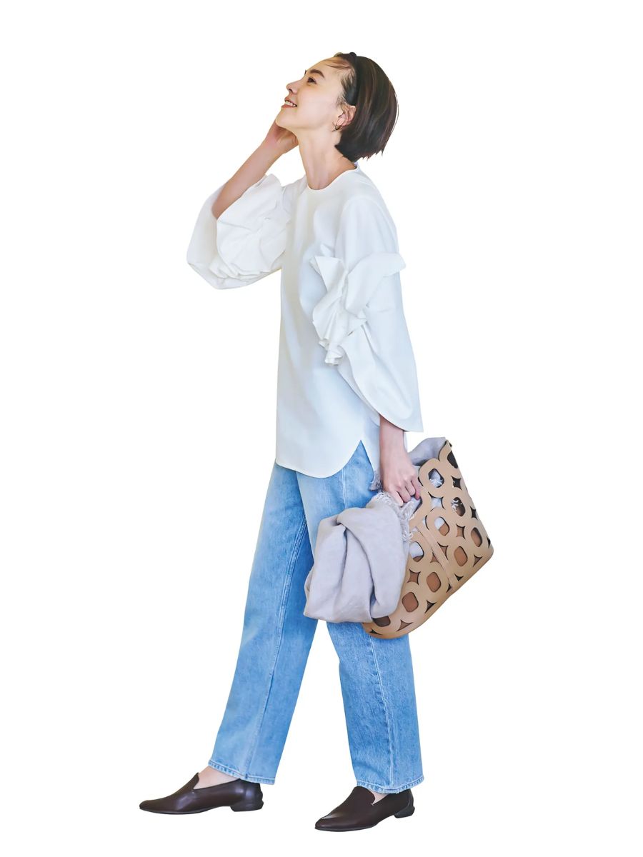 甘トップスとブルーデニムの甘辛コーデは春服の定番。お出かけ服にぴったりですが、ローファーでキリッとさせたら参観日や懇談会にもちょうどいい! ローファーはシーセイ、ブラウスはル フィル、デニムはレッドカード トーキョー、バッグはペリーコのもの。