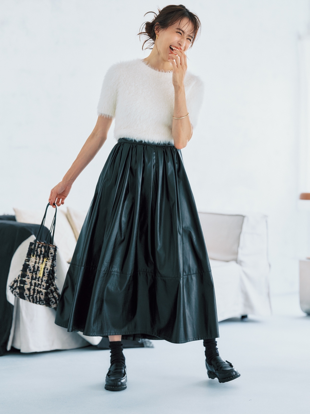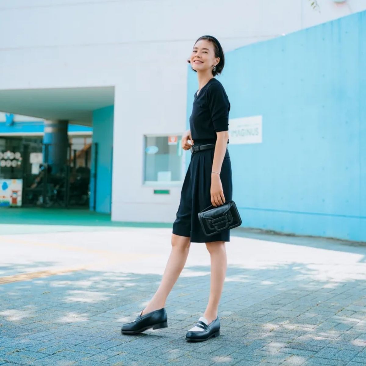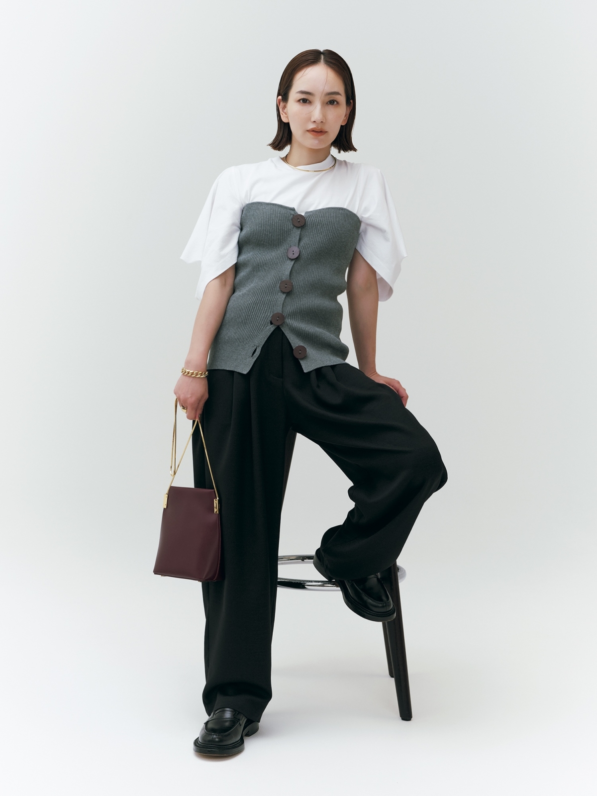 ボリュームソールのローファーは、スタイルアップにも効果的。ゆるパンツコーデがバランス良く仕上がります。ビスチェをオンして、地元にも街にもなじむキレイめゆるカジュアルに。ローファーはジェイエムウエストン、ビスチェ、Tシャツ、パンツはヘリンドットサイ、バッグはマエストソのもの。
