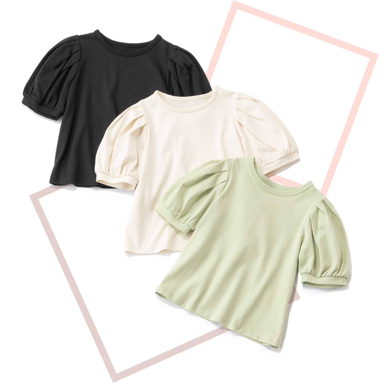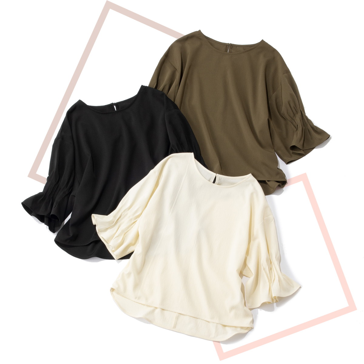 こんなキレイめブラウスももちろん乾燥機OK!袖タックブラウス各¥2,990〜(すべてベルメゾン)