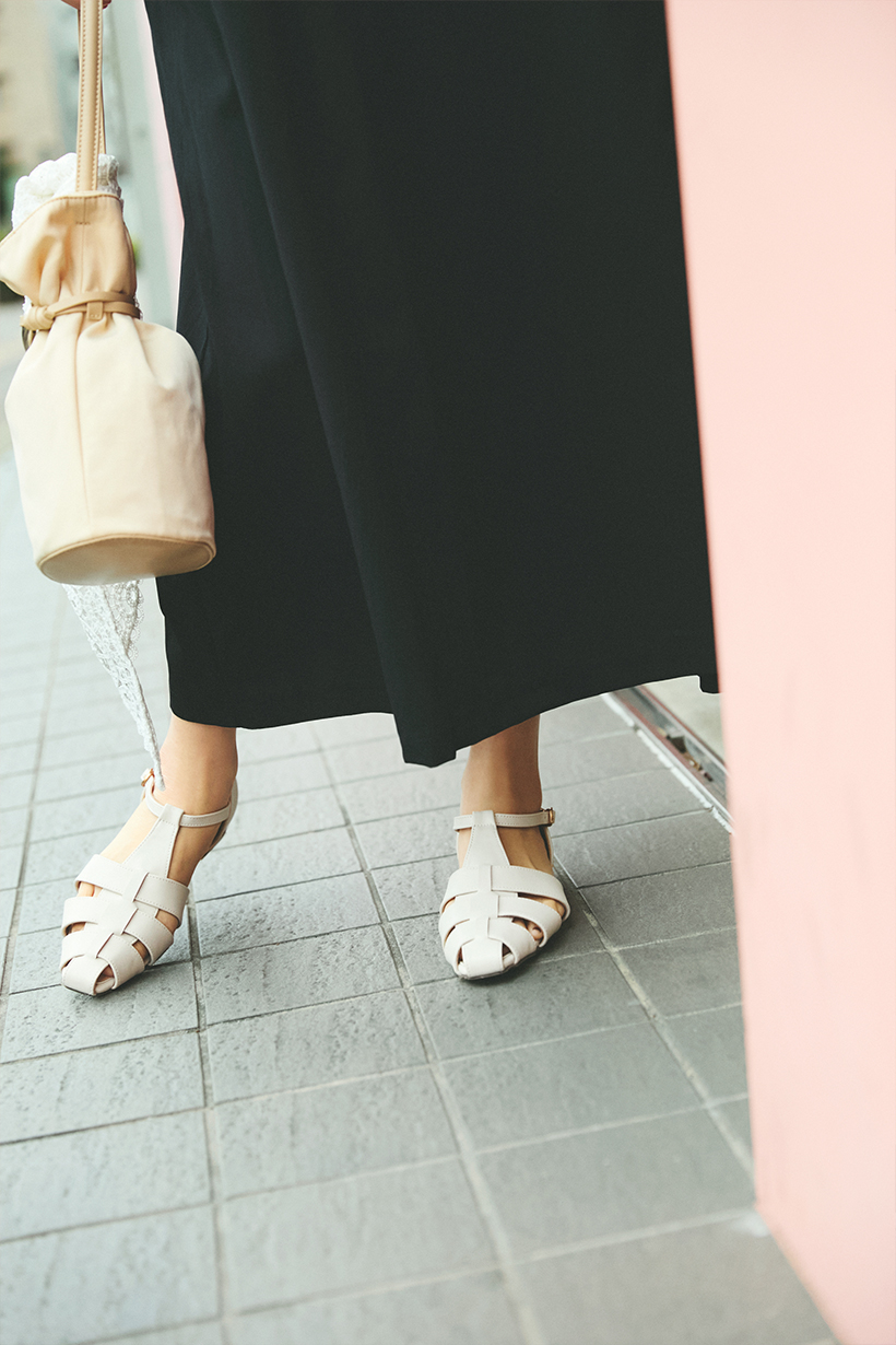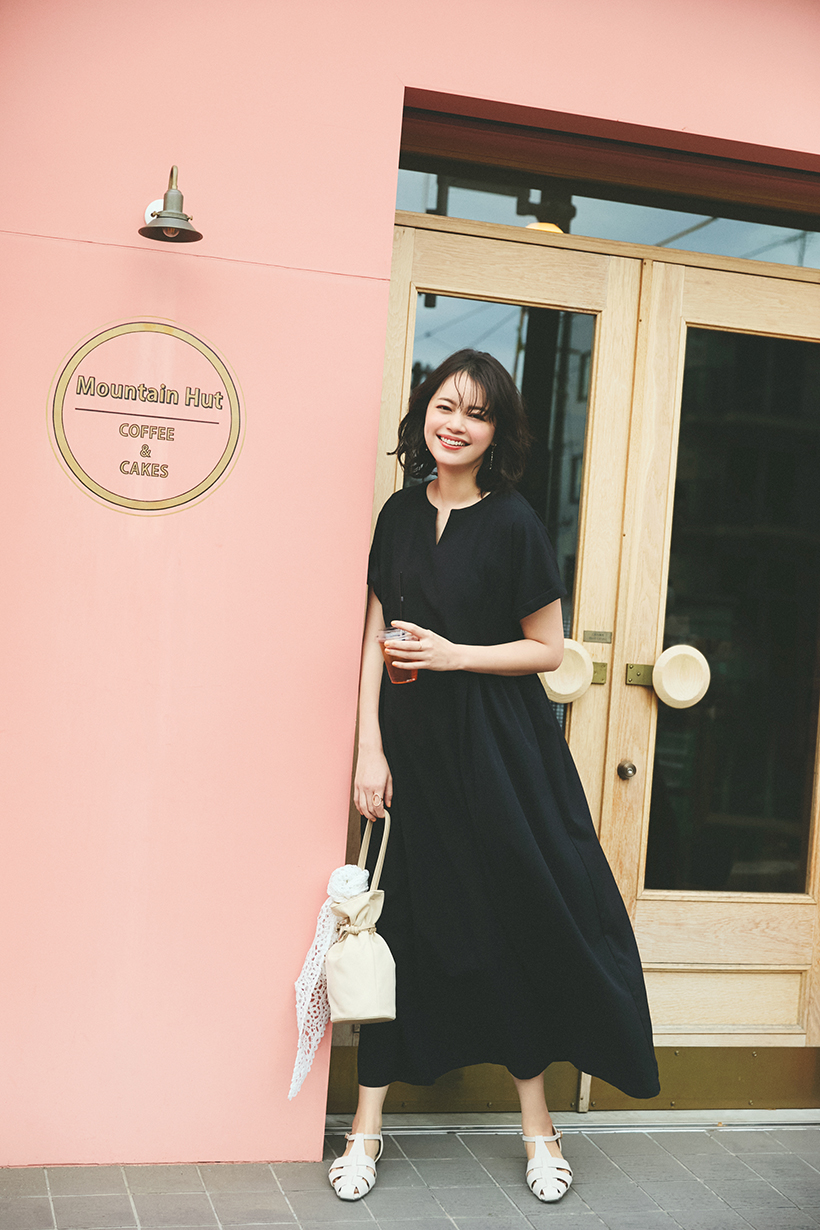 黒ワンピには白シューズで軽やかな抜け感をプラス!グルカサンダルならぺたんこでもきちんと見え。グルカシューズ¥6,990(スタイルノート/ベルメゾン)