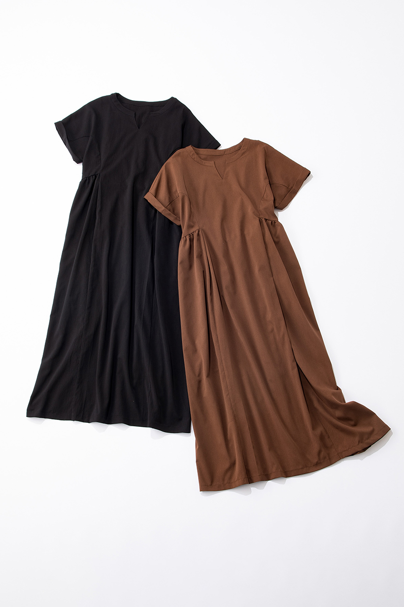 使いやすいブラックとブラウンの2色展開。防シワ、UVカット、接触冷感と機能面も完備!ウエストギャザーワンピース各¥4,990(ともにベルメゾン)