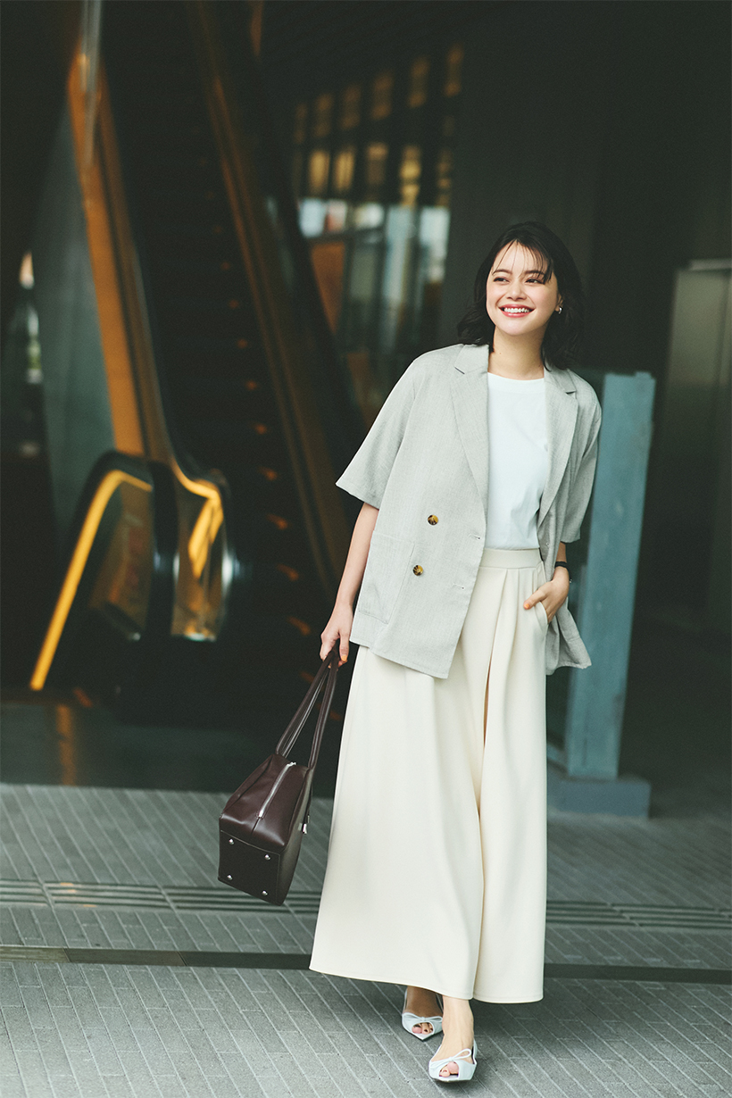 オフィス仕様からカジュアルまで幅広いシーンで着倒せるフレアスカート見えスカーチョは、ウエストまわりをカバーしてくれるラップデザイン♪スカーチョ¥3,290~<ラクドライ>ジャケット¥8,990〈スタイルノート〉Tシャツ¥1,980~〈サラリスト〉(すべてベルメゾン)バッグ¥6,990(ベルメゾン)その他/スタイリスト私物