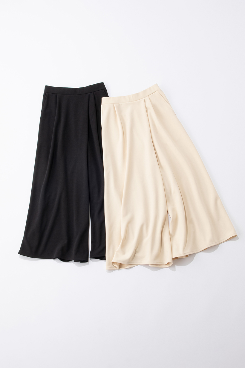 お仕事シーンに間違いなしのオフベージュ、ブラックの他、ソフトグリーンとブラウンの全4色展開。スカーチョ各¥3,290~(ともにラクドライ/ベルメゾン)