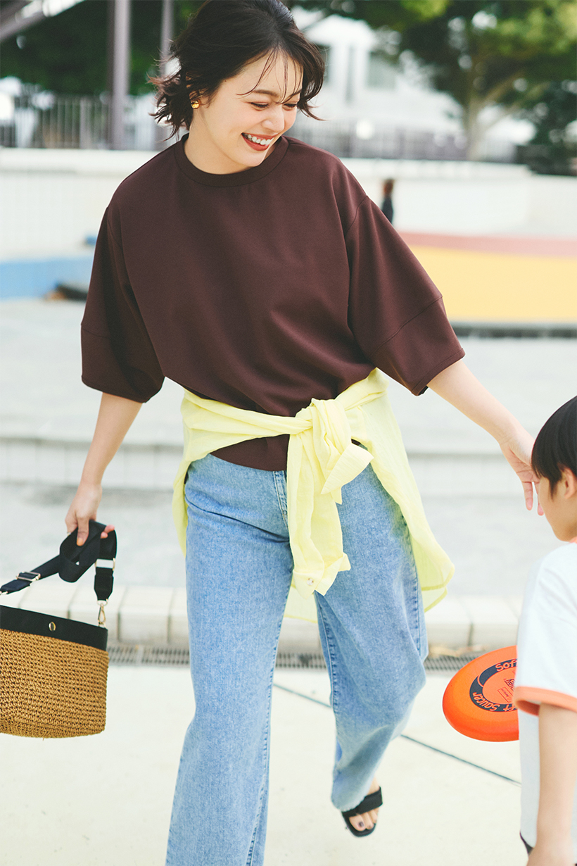 公園カジュアルをきれいめに仕上げてくれる人気のランタンスリーブブラウス。洗濯機→乾燥機のイージーケアだから、キッズと一緒に思い切り休日を満喫!ランタンスリーブブラウス¥2,990~<ラクドライ>腰に巻いたシャツ¥4,290~デニムパンツ¥3,990〈ともにロウイング〉バッグ¥5,990〈スタイルノート〉(すべてベルメゾン)その他/スタイリスト私物