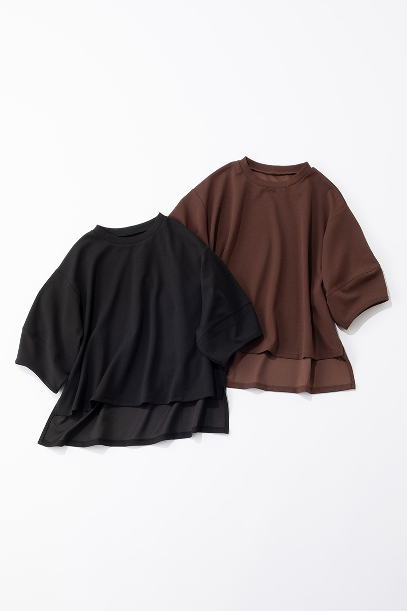 二の腕をカバーするランタン型の袖と、サイドスリット入り&後ろがやや長め丈なので体形カバー効果も◎。キレイめに見えてストレッチ性もあり、オンもオフもついつい手に取りたくなる一枚。ランタンスリーブブラウス(ブラック、ブラウン)各¥2,838〜(ともにベルメゾン)