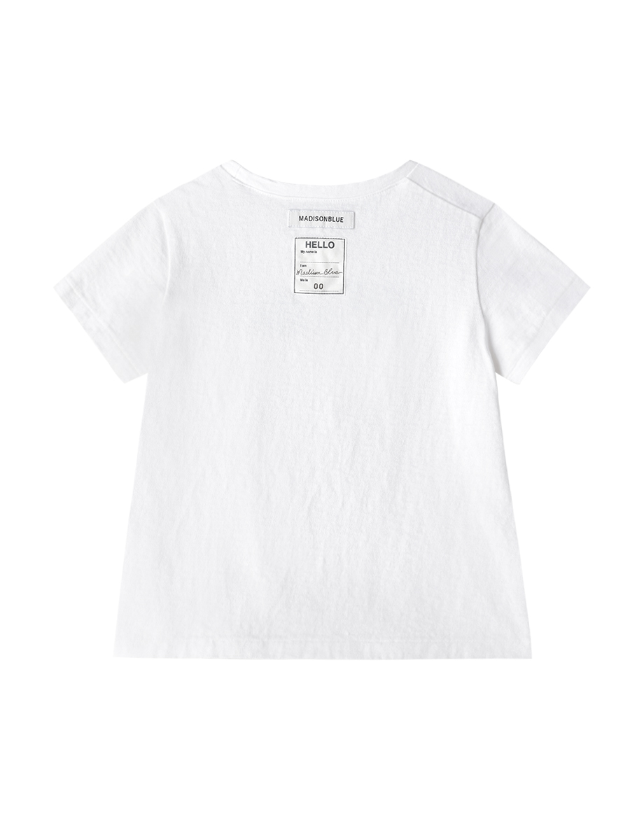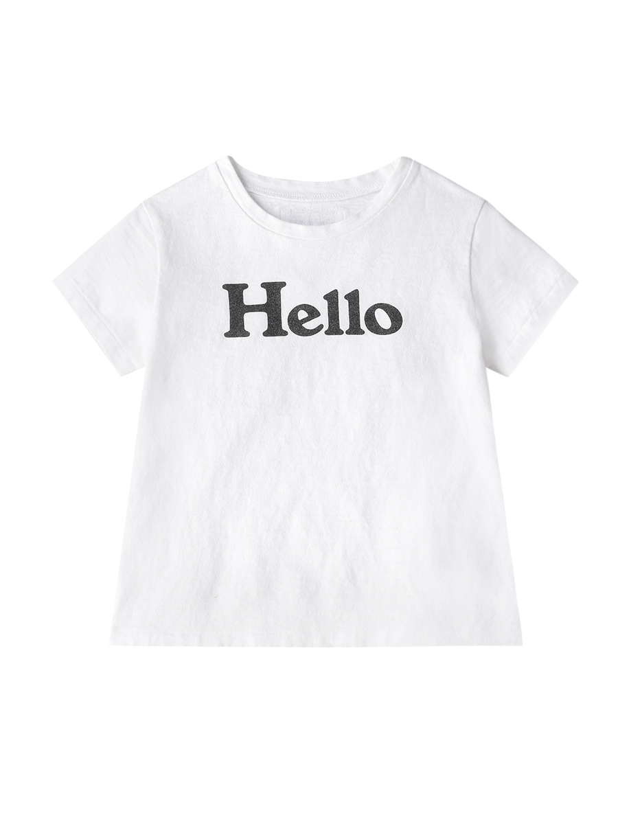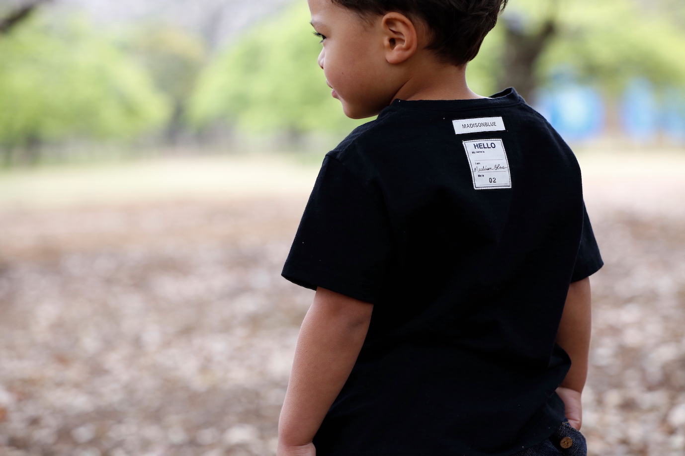 首の後ろでカサカサと気になることもある商品タグは、外側に配置することで子どもたちの繊細な肌を守りつつ、バックスタイルのアクセントにも。新学期が始まり、「はじめまして」の場面が目白押しの今。胸に「HELLO」と書かれたTシャツを通してコミュニケーションが生まれるかも!