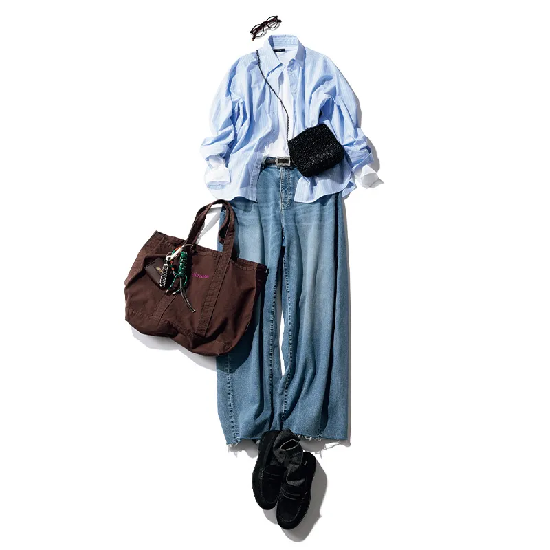 爽やかなブルーのシャツなら、なんだか暑さも紛れそう。日除けにはもちろん、嵩張らないので暑くて脱いでも荷物にならないのがうれしいポイント。防シワ生地ならより安心です。可愛げショルダーをお供に、機動力もオシャレ心も満たして。シャツはロペピクニック、カットソーはイレーヴ、デニムパンツはアンフィーロ、ショルダーバッグはアンテプリマ、トートバッグはザ シンゾーン、ローファーはモリーニのもの。