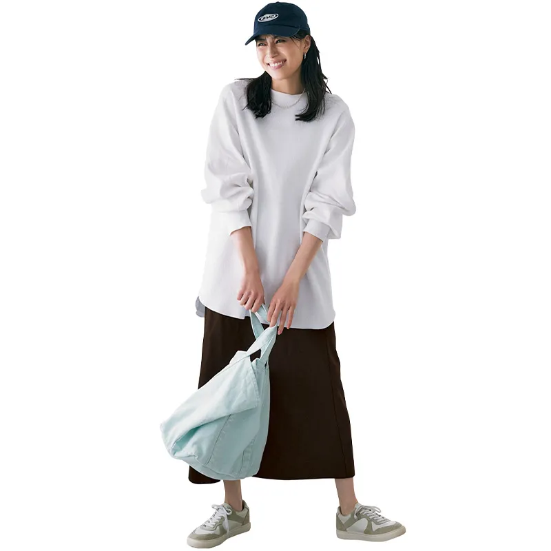 目的地が水族館や博物館など、体を動かす予定がないならスカートも選択肢。汚れの目立ちにくい、濃い色のものがおすすめです。温度調節機能に優れたサーマルロンTを合わせれば、朝の冷え込みと暑い日中の寒暖差にも対応できそう。トップスはハイク、スカートはマイストラーダ、キャップはシー、バッグはGap、スニーカーはヨークのもの。