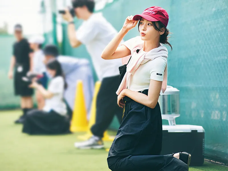 しゃがんだり立ったりが多いうえ、写真を撮られる回数も増えて着崩れが気になる遠足に、ボディスーツが一役買ってくれる。定番の白Tは、子どもも見つけやすいカラーキャップで差別化を。ボディスーツはTW、スカートはHER.、肩に巻いたニットはエリオポール、キャップはザ シンゾーン、ウエストポーチはダン、スニーカーはダニエラアンドジェマのもの。