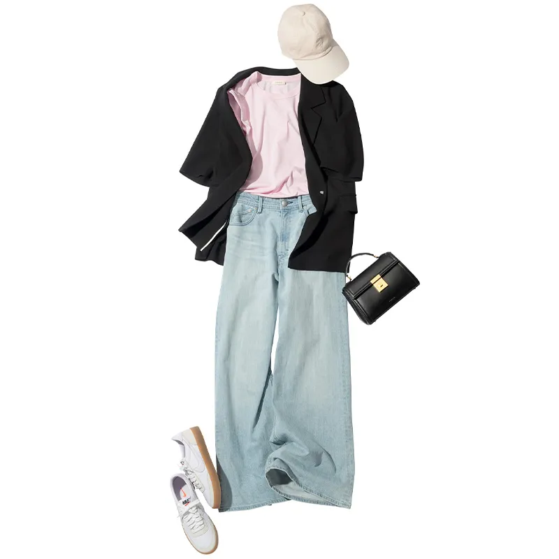 Tシャツ+デニムに半袖ジャケットを羽織れば、かしこまりすぎない&きちんと見えのバランス良し。遠足でも浮かず、それでいて安心感も。先生やママとの交流も自然体で過ごせます。ジャケットはミースロエ、Tシャツはデ・プレ、デニムはヤヌーク、キャップはアッパーハイツ、バッグはデメリエーロンドン、スニーカーはナイキ スポーツウェアのもの。