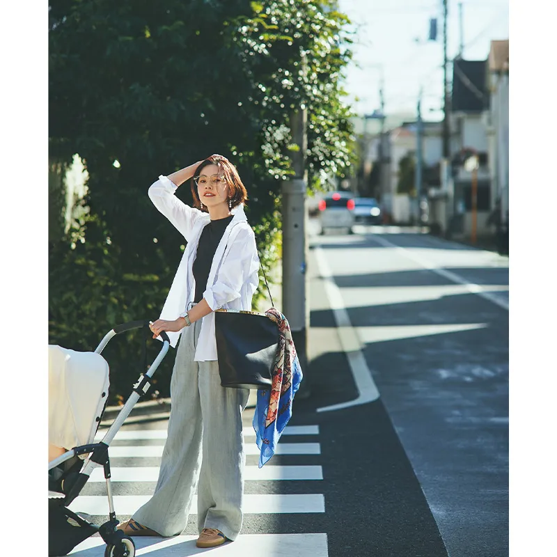 クリーンな白シャツは羽織るだけで、きちんとした印象に仕上げてくれる優れもの。レフ板効果で、顔色も明るく見せてくれそう。シャツはギャルリー・ヴィー、ニットはナイスナイス モーメント、パンツはデ・プレ、バッグはトッズ、スニーカーはadidas Originals、ストールはマニプリのもの。
