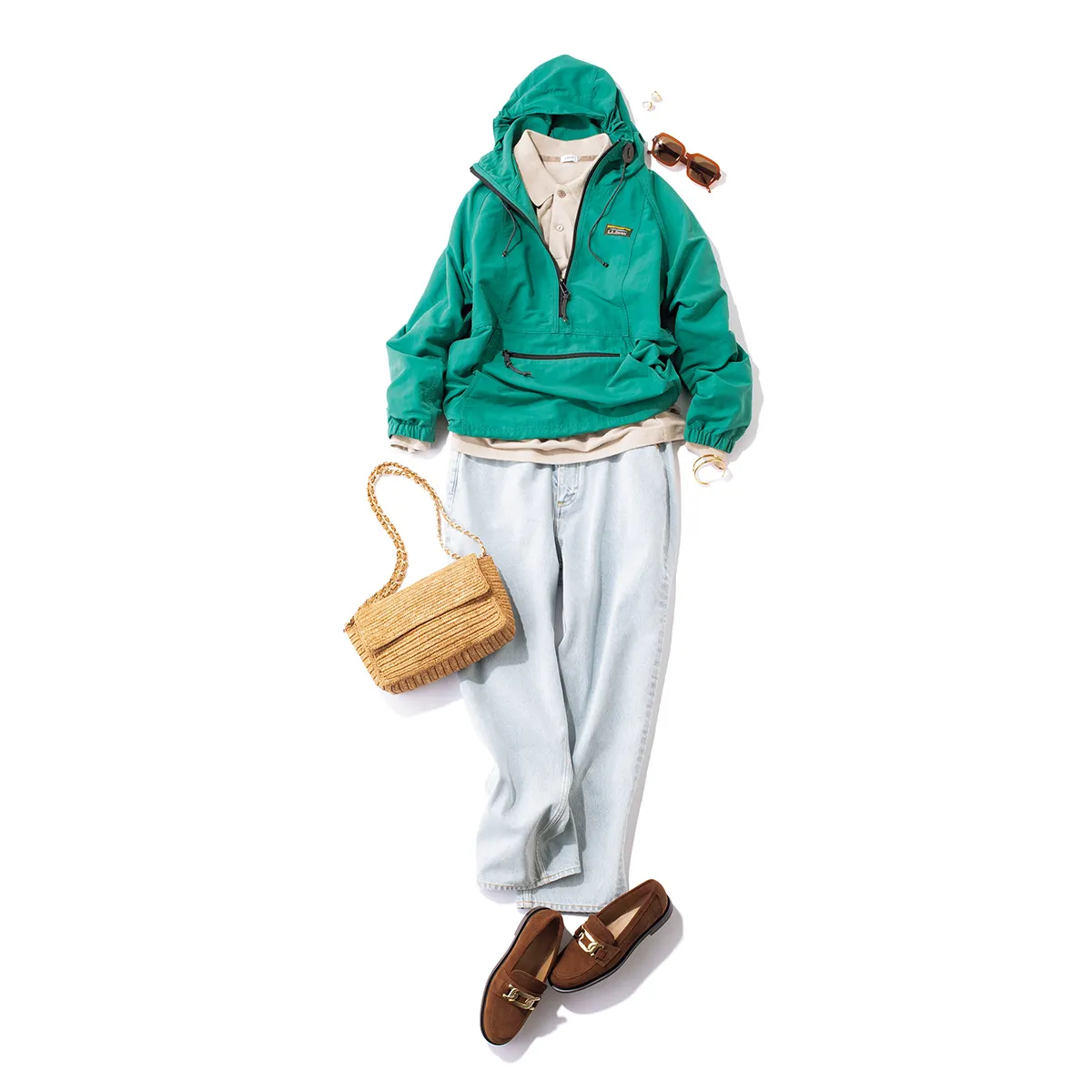 トレンドのアノラックパーカは、防風&撥水機能付きのアイテムも多く、水辺や突然のお天気雨もへっちゃら。ポロシャツやシャツなど、衿つきアイテムをなかに仕込むときちんと感を演出できます。パーカはエル・エル・ビーン、 ポロシャツはロエフ、デニムはトラディショナル ウェザーウェア、バッグはトンガソアアーティザナル、靴はオデット エ オディールのもの。