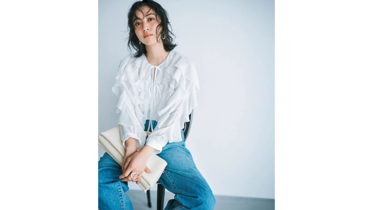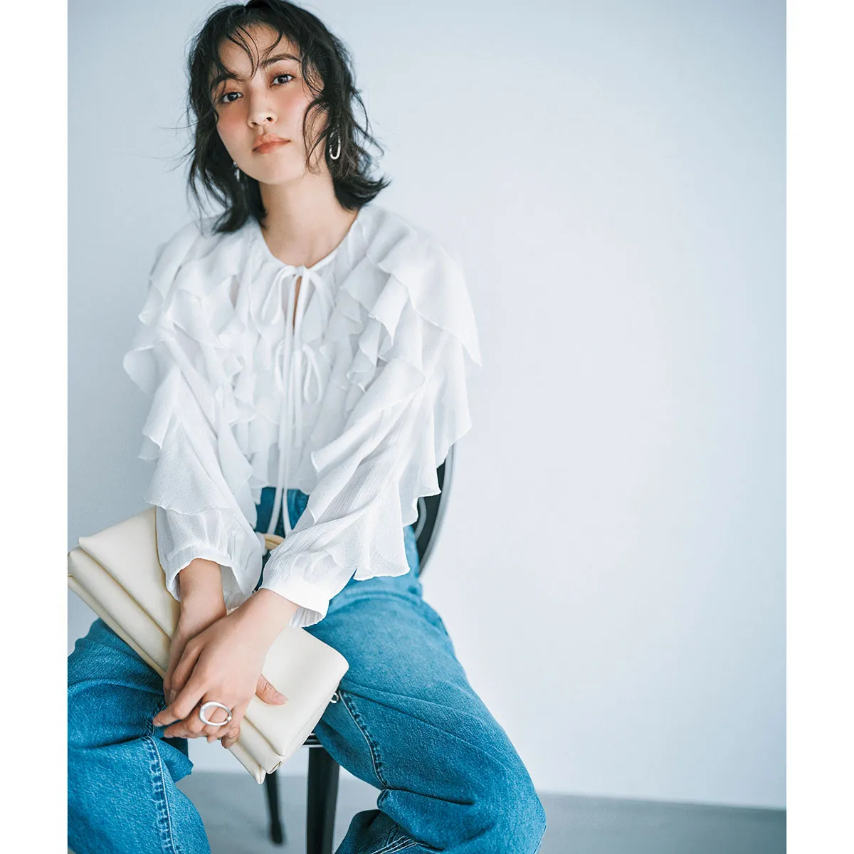 トレンドの透け感を楽しめるシアー素材の軽やかな着心地。ブラウス¥24,420(エルド)デニムパンツ¥22,000(ニードバイヘリテージ/ゲストリスト)バッグ¥9,900(カカトゥ/アンビリオン)ピアス¥31,020リング¥29,480(ともにバルブス/ZUTTOHOLIC)