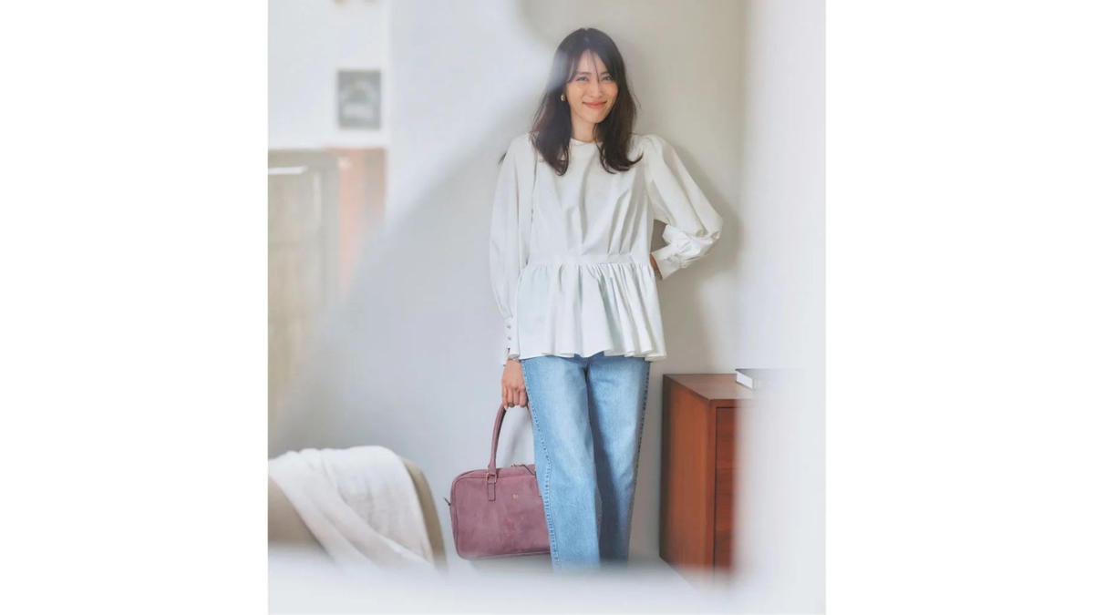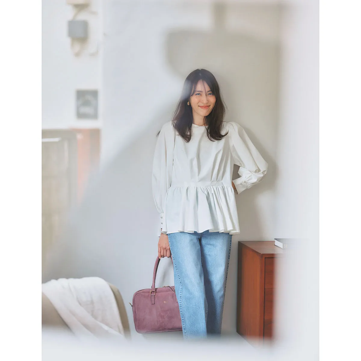 袖口にゴムが入って、七分袖のようにも着こなせるから、春から初夏まで長く活躍。ブラウス¥18,700(スリースクエア)デニムパンツ¥27,500(アッパーハイツ/デミルクス ビームス 新宿)イヤリング¥8,800(アビステ)バングル¥36,300(アナプノエ/フォーティーン ショールーム)バッグ¥44,660(テラ/ティースクエア プレスルーム)