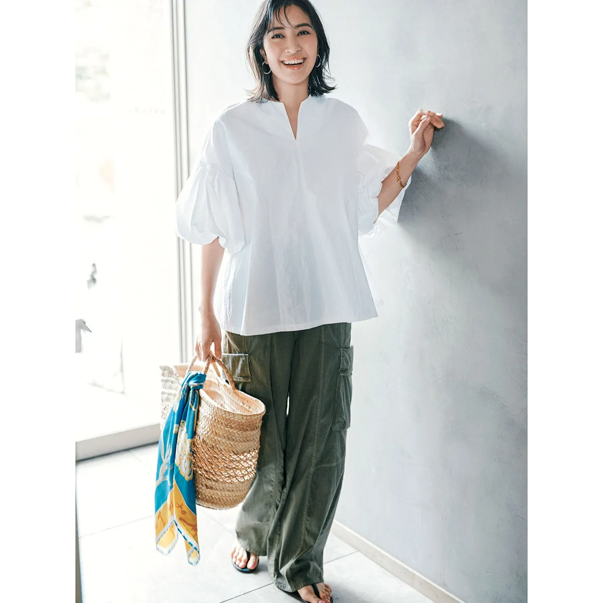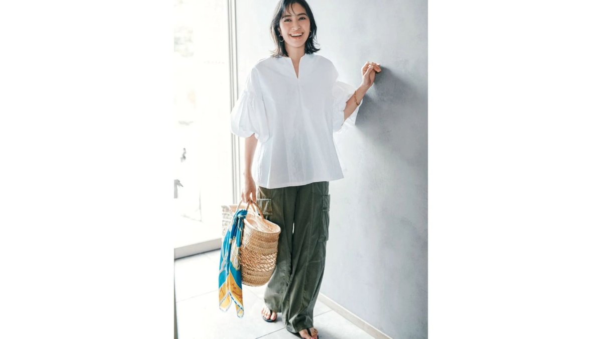 カジュアルなボトムスとも相性抜群で、清潔感のある着こなしに。ブラウス¥15,400(スリースクエア)パンツ¥39,600(ダブルスタンダードクロージング/フィルム)バッグ¥14,300(ケッシュ ル エッセンシャル/ザ エディット ストア)サンダル¥28,600(ラオコンテ/フラッパーズ)スカーフ¥22,000(マニプリ)ピアス¥19,360(ラブ・エージェイ/ZUTTOHOLIC)ブレスレット¥5,500(アビステ)
