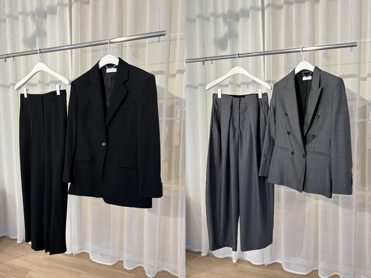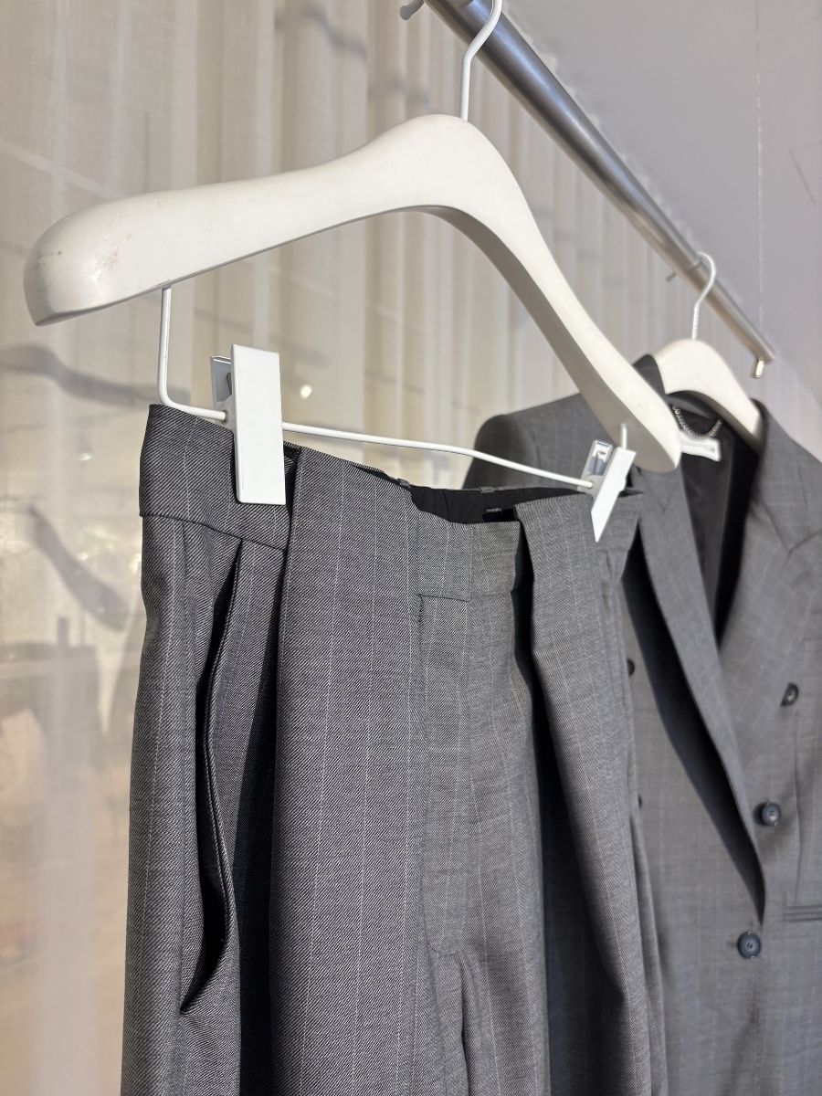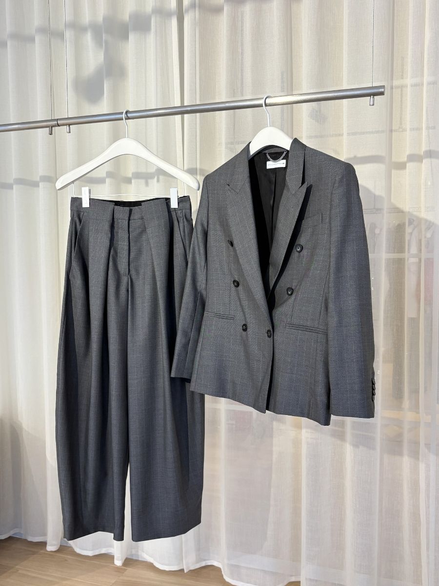 ピークドラペルが華やかなグレーのダブルジャケットとウエスト周りのタックデザインが効いたワイドパンツ。まとった瞬間、スマートなオーラに包まれて自信が湧きそうです。控えめなストライプはカジュアルな装いにも合わせやすく、単品でも活躍してくれます。特にパンツは、シンプルなトップスとのワンツーコーデも格上げしてくれること間違いなし!
