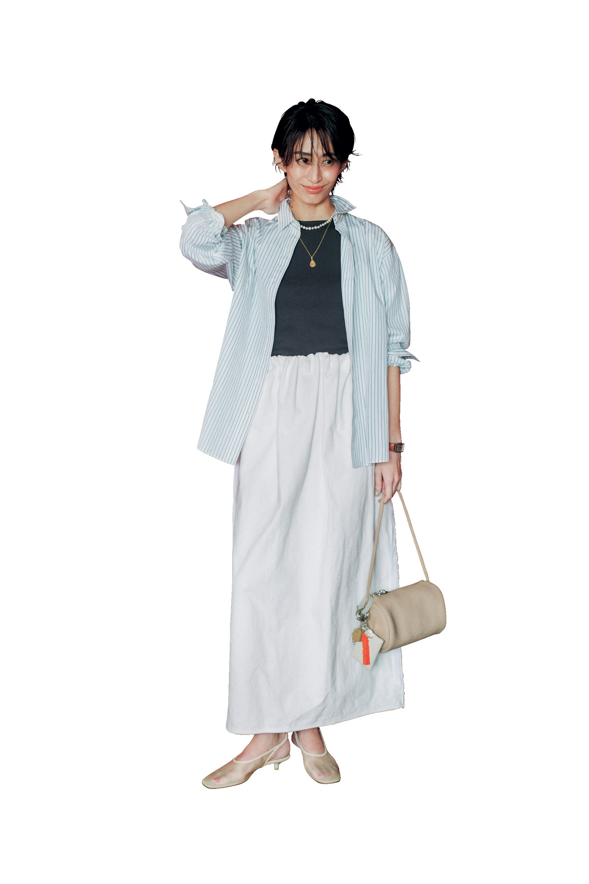 膨張しがちな白コーデは、シャツのかっちり感を合わせるとすっきりした印象に。ブルーシャツなら春らしい爽やかさも手に入ります。