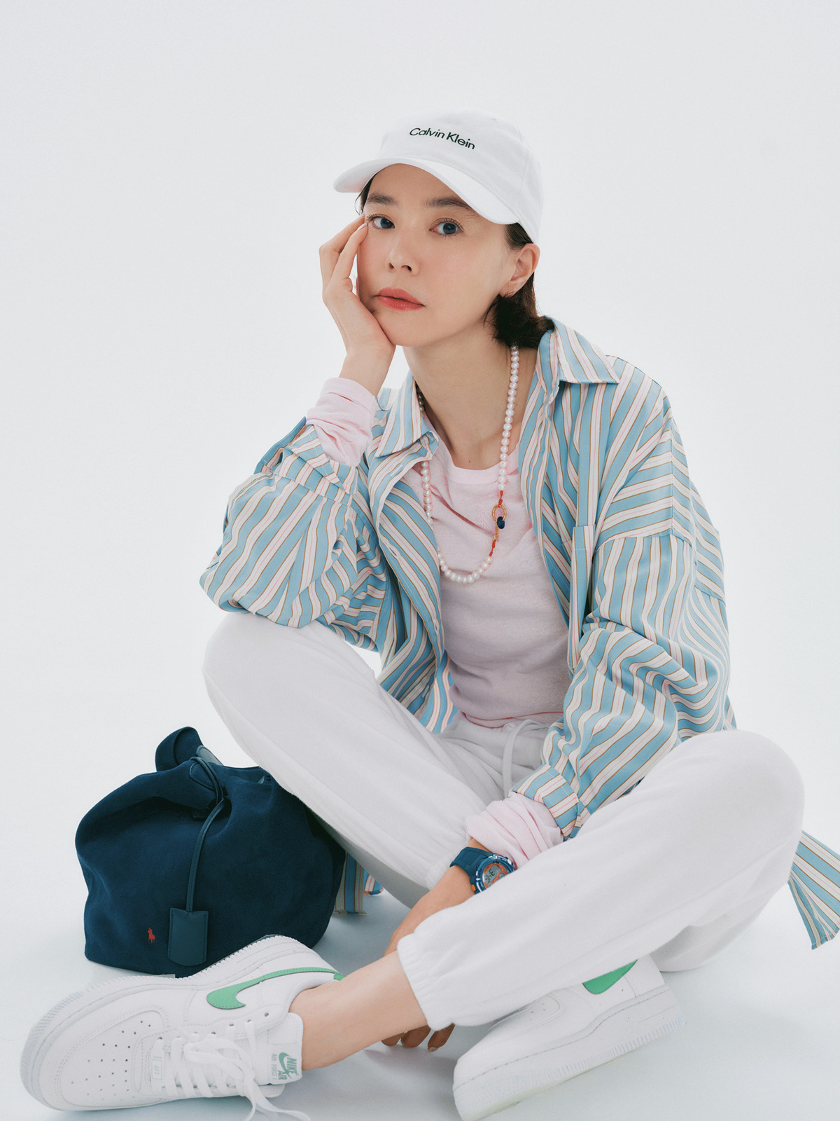 キャップやスニーカー、スウェットなど公園見守りの常連アイテムをとことん投入した日も頼れるシャツ。使いやすいブルーベースなら、キャッチーなストライプもトライしやすいはず。