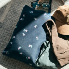総柄プリントを裏返すと、yorタグ付きのシンプルなiキャンバス素材のネイビートートに変身! 送迎や学校説明会、仕事などのきちんとシーンに使いやすいのがうれしい。