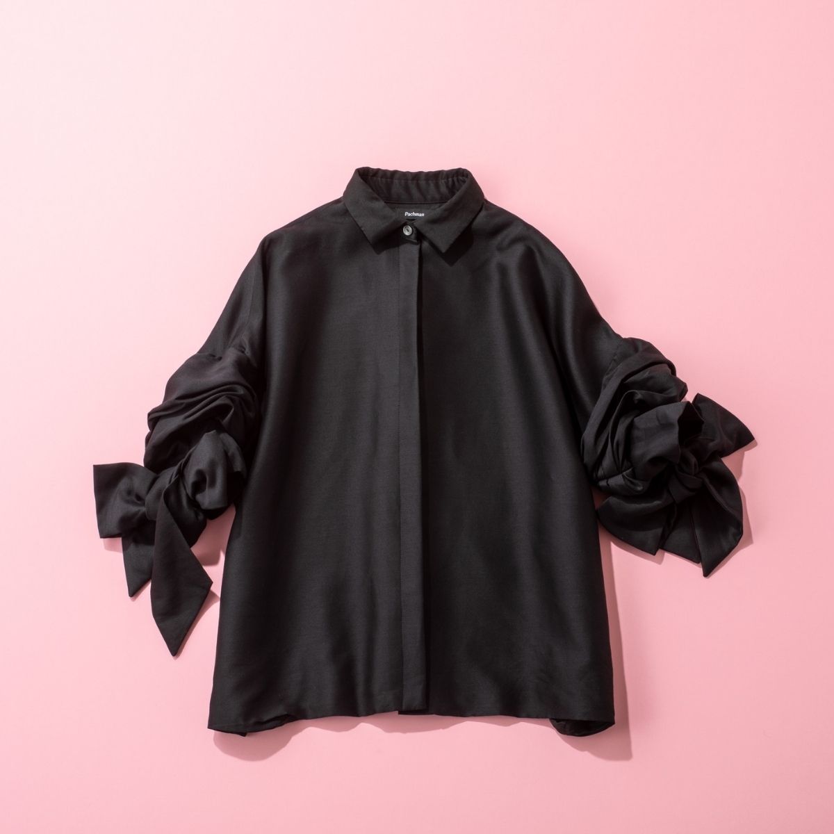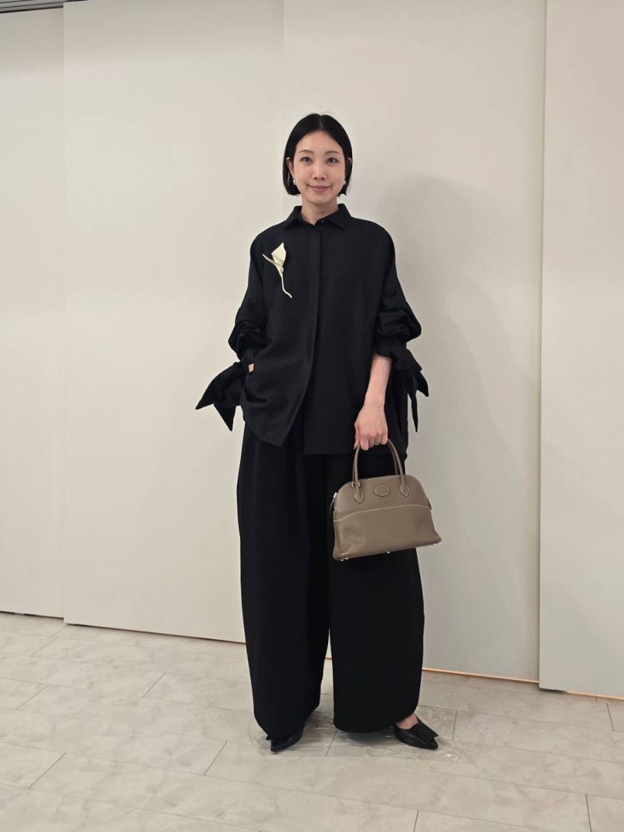そうした流れのなかで出会ったのが、Pachman(パハマン)のブラウス。クラフトマンシップを感じる丁寧な仕立てや素材のクオリティの高さに信頼を置いているブランドで、このブラウスも独特なフォルムに一目惚れならぬ、一着用惚れして即連れ帰ったものです(笑)。袖のリボンひとつにしても、垂れ下がらずに計算された角度でピンと立つハリのある素材には惚れ惚れ。絶妙にモードで、甘さが苦手だった私でも取り入れやすく、モノトーンに偏りがちな日常のおしゃれを格上げしてくれます」