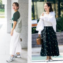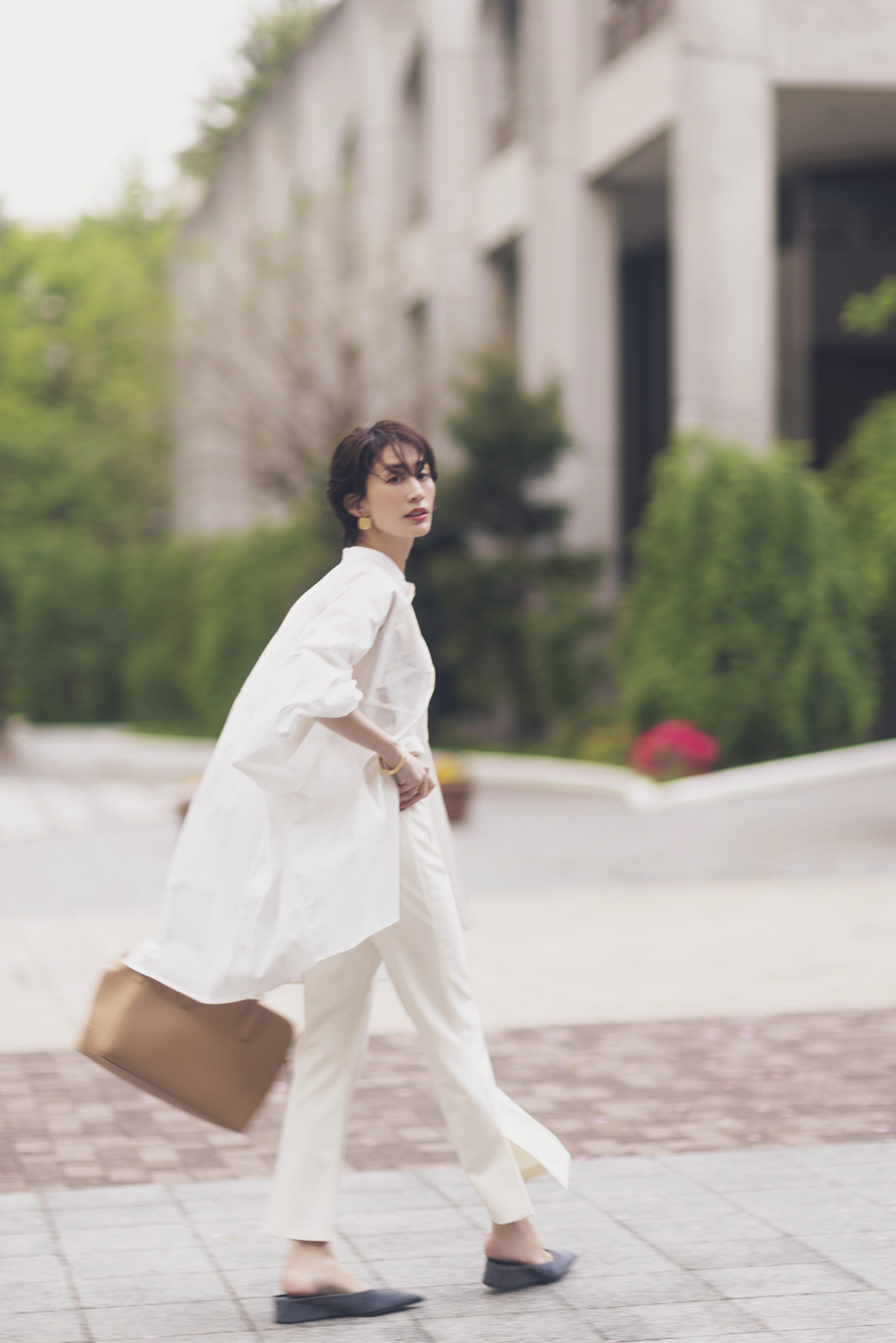 鉄板の黒パンツ合わせもいいけれど、いさぎよくオール白でまとめると新鮮。シンプルな合わせだからこそ、オーバーサイズを選んでシルエットに変化を出すのがおすすめです。