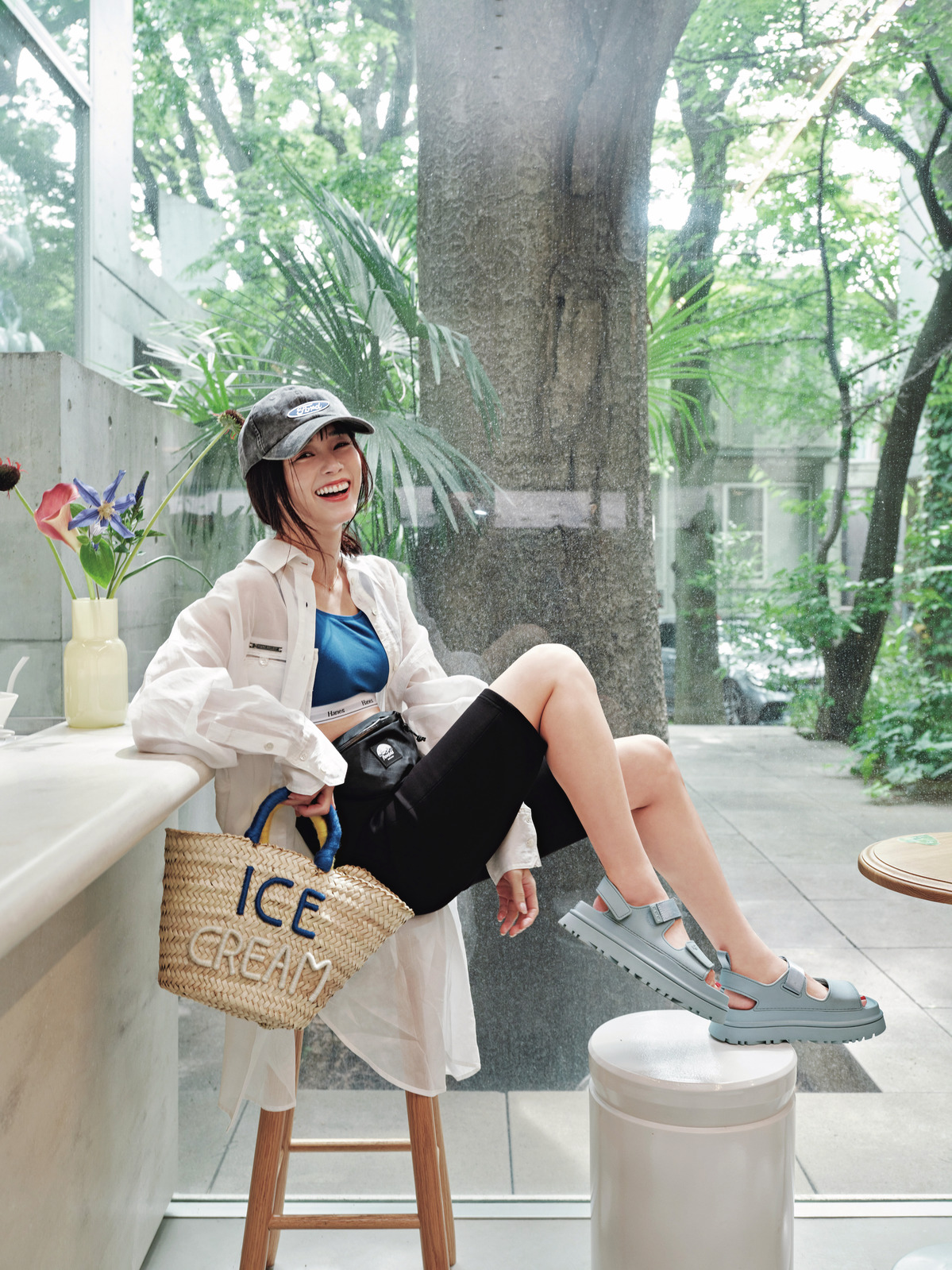 実はスポーティな着こなしにもハマるのが白シャツのすごいところ。透け感があるものを選ぶとかっちりしすぎず、いつものジムウェアがタウン仕様にワンランクアップ。