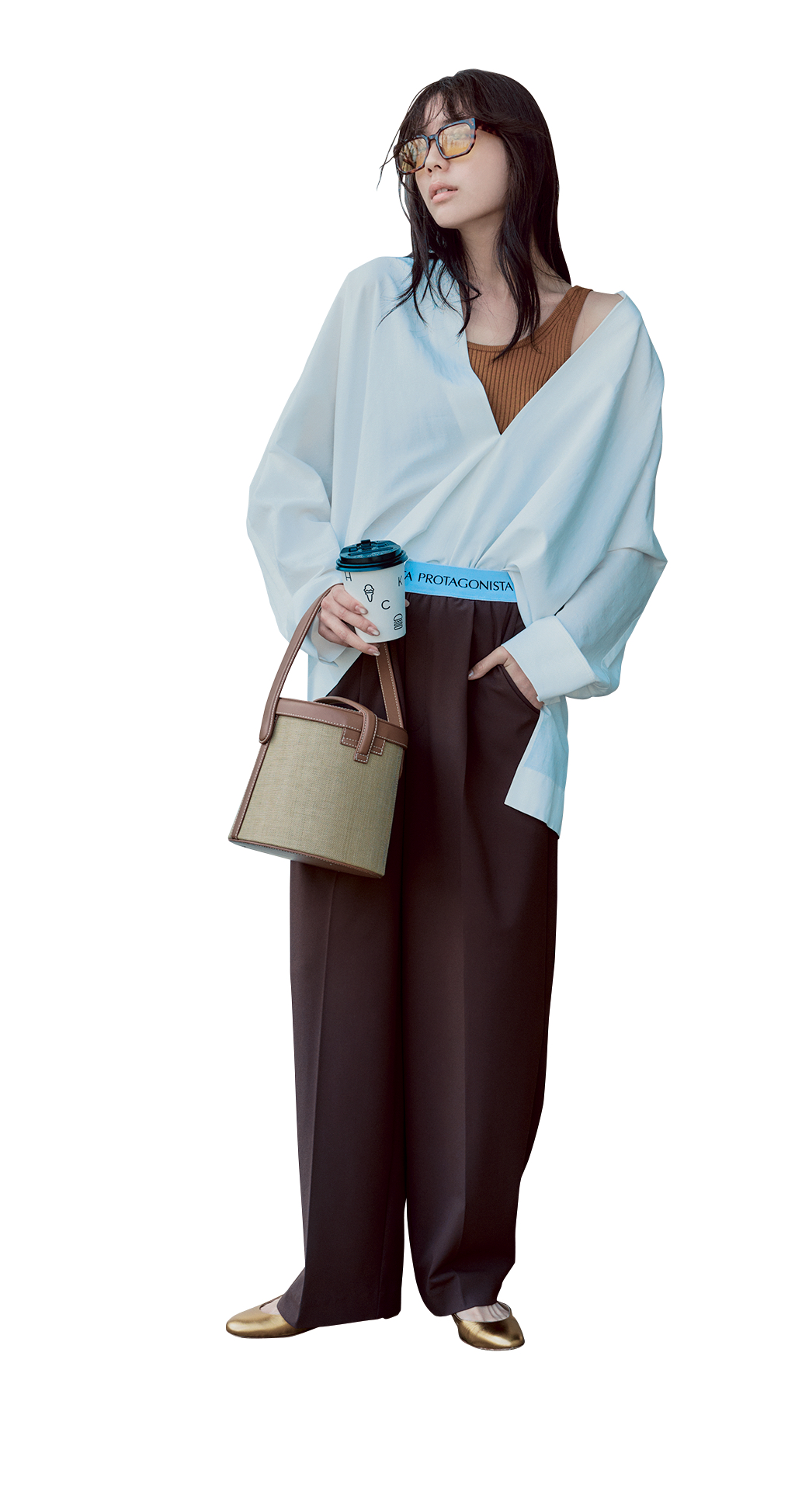 下着をチラ見せしているようなちょっと攻めたロゴパンツを穿くときは、ボタンも装飾もないシンプルな白シャツで引き算。スキッパータイプはインナーのチラ見せも楽しめます。