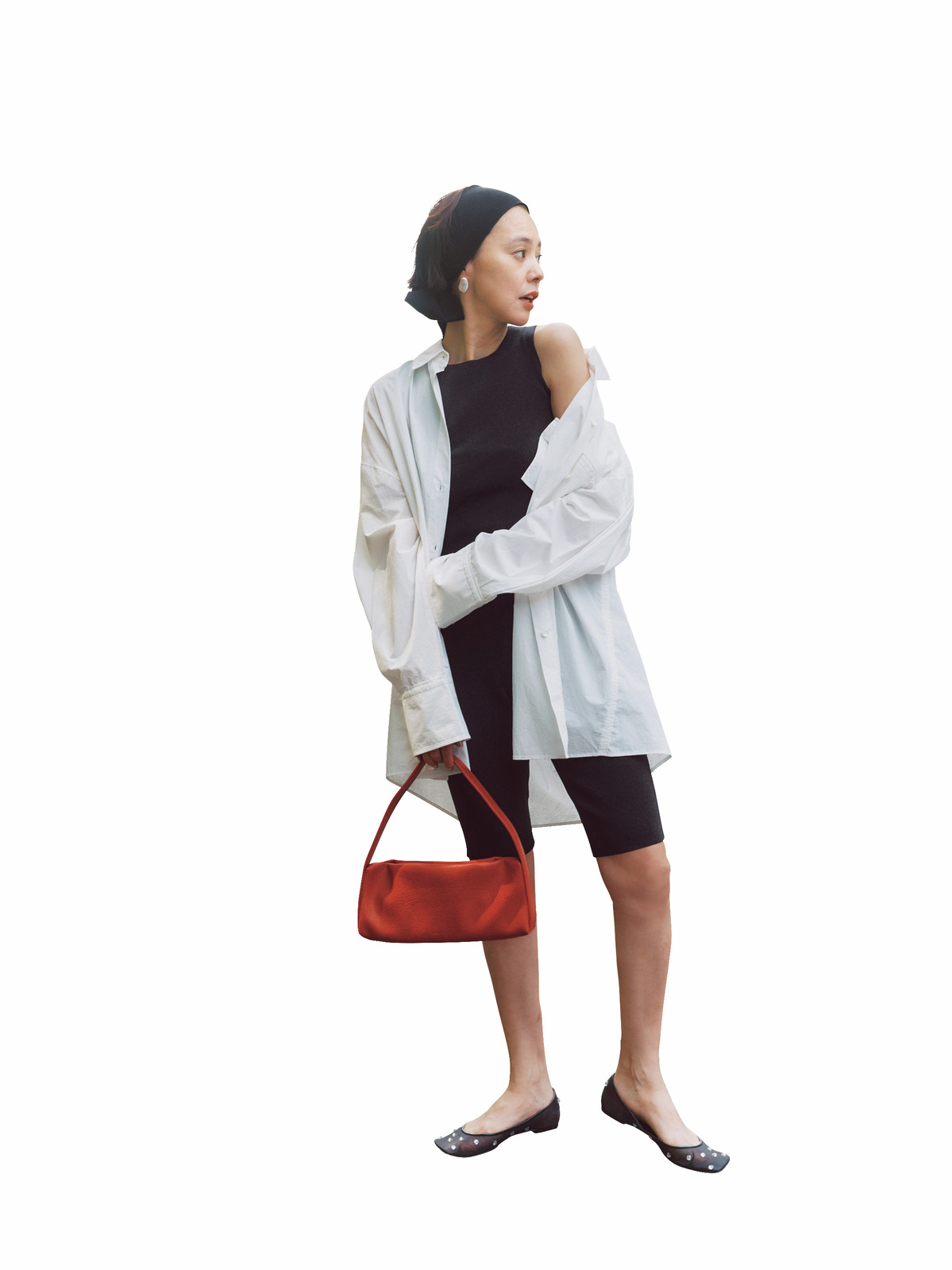 羽織るだけできちんと感がアップする白シャツがあれば、着心地らくちんなサイクリングパンツも堂々と着られます。モノトーンでまとめるときれいめに。