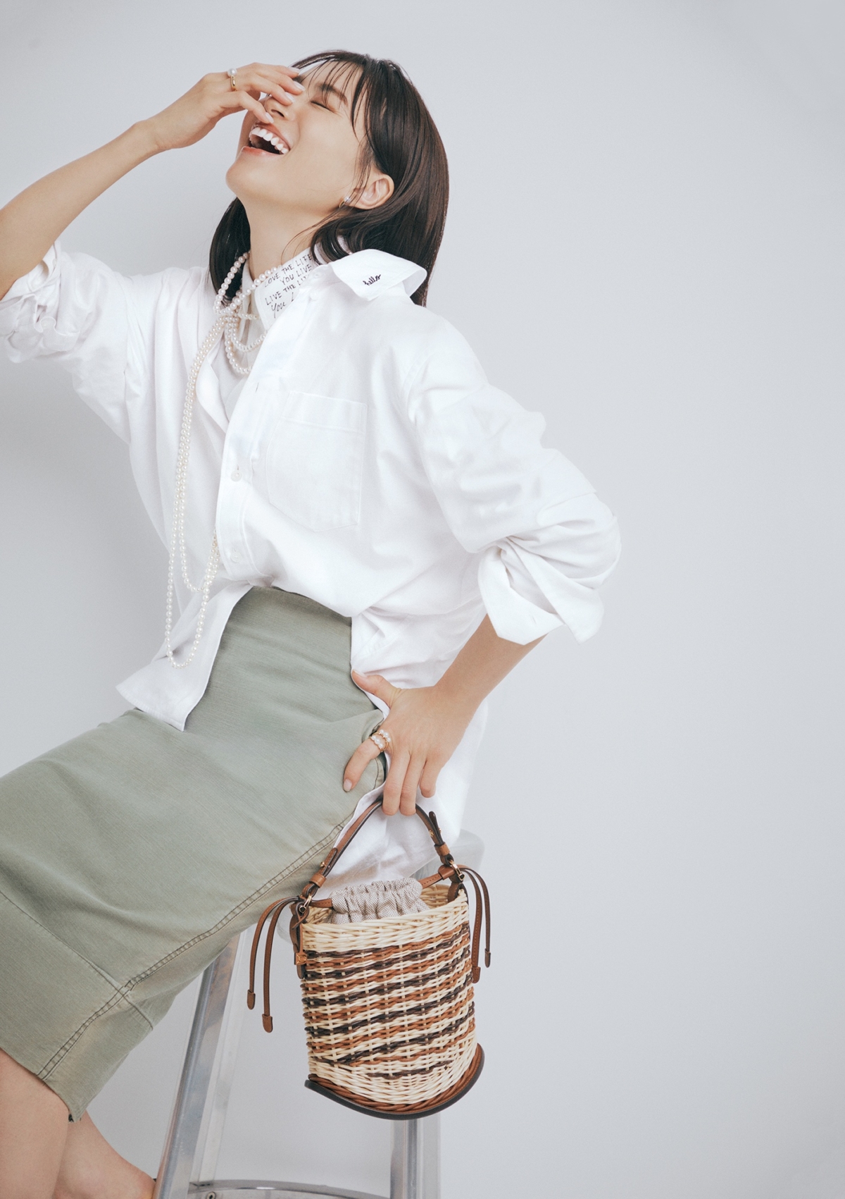 ワンツーコーデだときれいめすぎるタイトスカートとの合わせは、インナーにもう一枚シャツをプラスすることでドラマチックに。小物も大ぶりなものを選ぶとまじめすぎません。