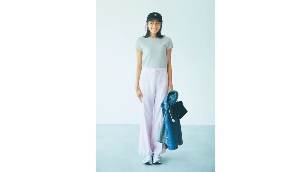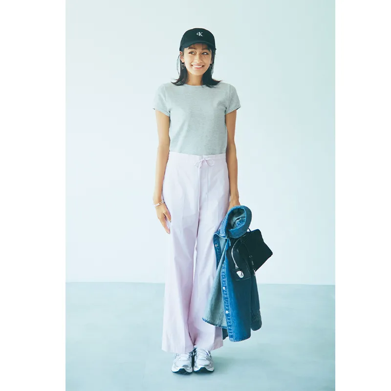 楽ちんパンツ×Tシャツのカジュアルは、デニムシャツで着こなしにシャープさを。
