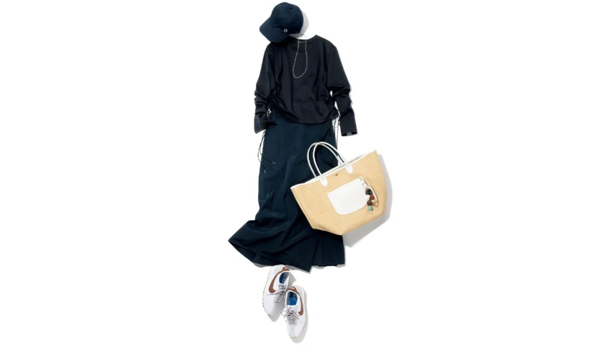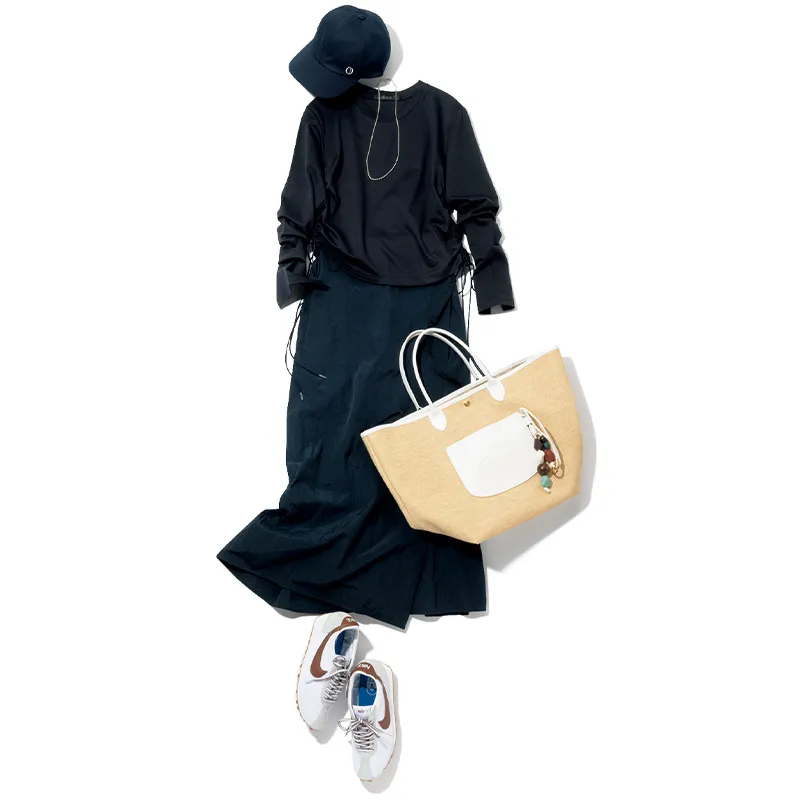 ギャザートップスはハリ感のあるスカートとキャップでアクティブな味つけを。