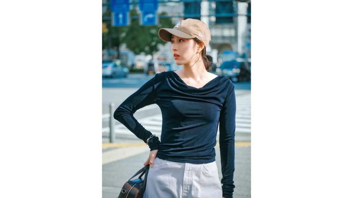 ベージュカラーのキャップがキレイめに馴染む。トップス¥13,200(アニュアンス)パンツ¥28,600(ヤヌーク╱カイタックインターナショナル)バッグ¥41,800(ロー ソウル)キャップ¥4,620(ニューエラ)ピアス¥4,320(アビステ)ブレスレット¥32,780(チビ・ジュエルズ╱チビジュエルズ・ジャパン)