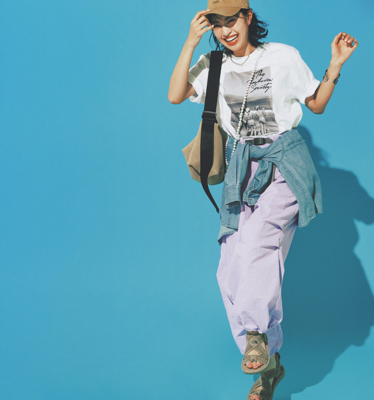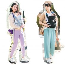 印象の強いプリントTはパステルパンツに合わせると優しげに。パラシュートタイプは裾汚れも気にせず公園遊びも楽しめそう。