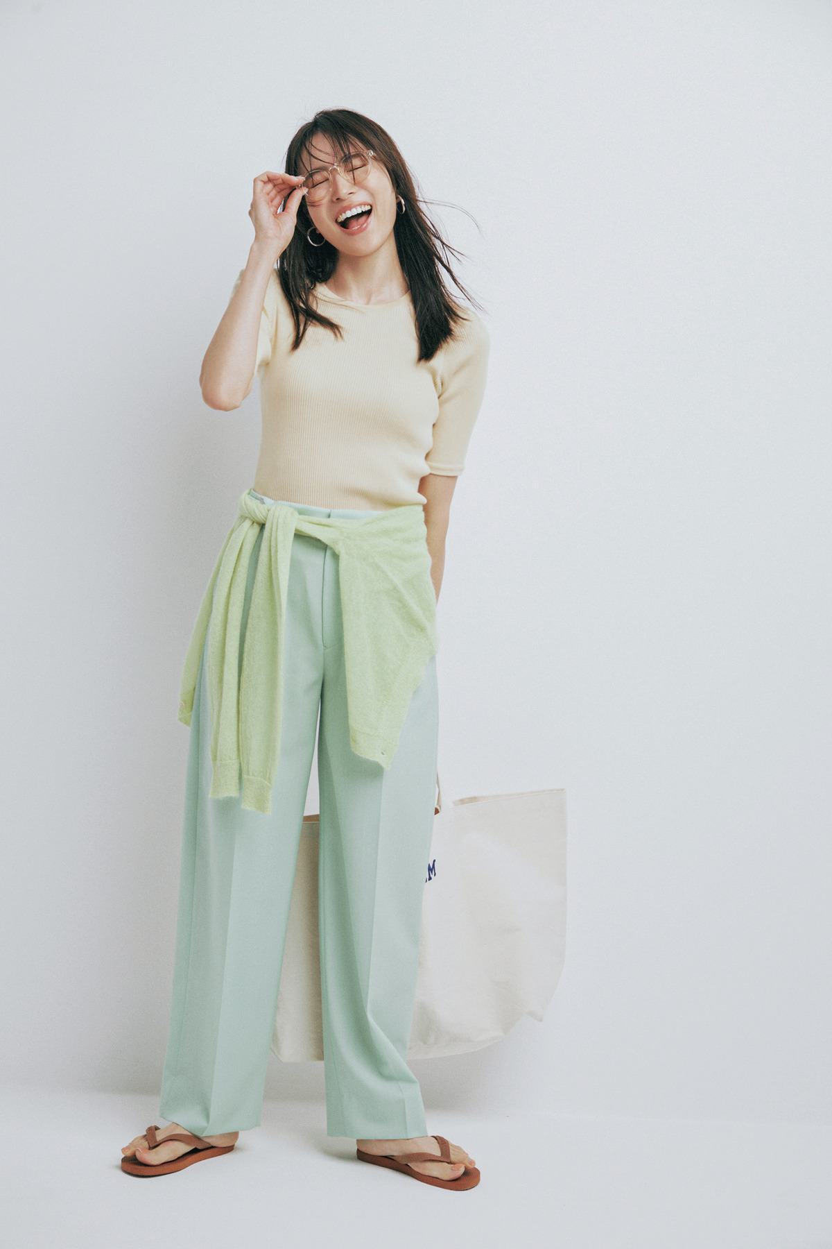 白Tももちろん似合いますが、パンツに合わせてTシャツをペールトーンに揃えるのも素敵。センタープレス入りのパンツならよりきれいめにまとまります。